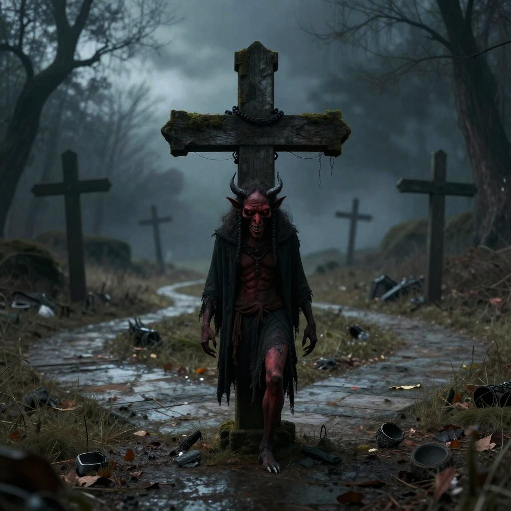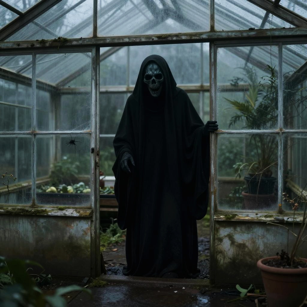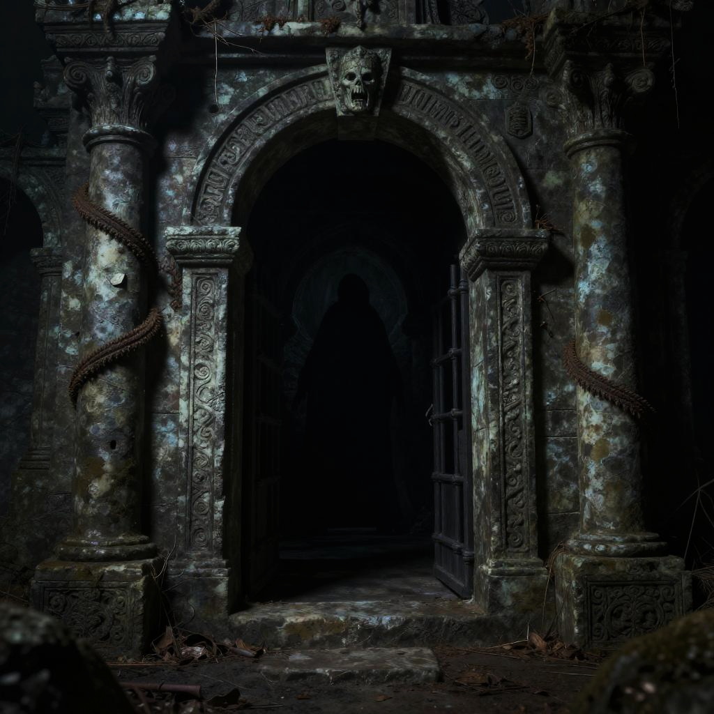 Photograph of a large, black and white-feathered bird standing in a dilapidated, rusted doorway of an abandoned building. The bird has a prominent white crest, black eyes with a pale blue beak, and red talons. Its feathers are dense and textured. The background shows a dark, shadowy interior with patches of light filtering through broken windows. The doorway's metal frame is heavily corroded, and the surrounding walls are peeling and worn. Grass and small plants grow at the base of the doorway, adding a touch of green to the otherwise decayed scene. The overall atmosphere is eerie and foreboding.