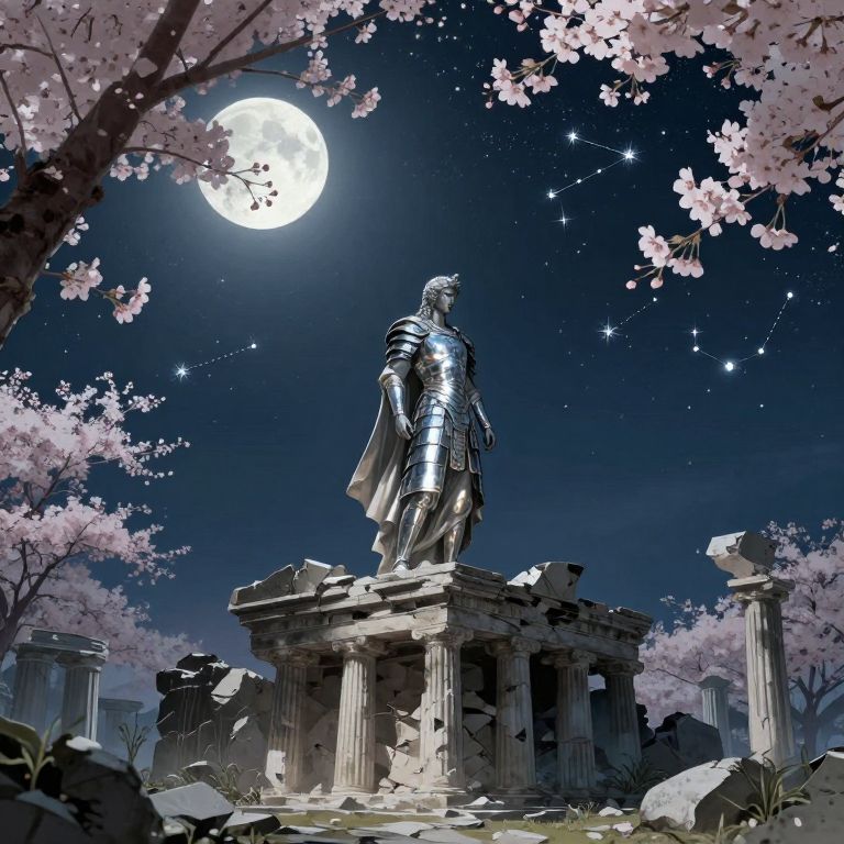 Imagine an otherworldly landscape bathed in moonlight, where a lone figure stands atop a crumbling ancient structure reminiscent of Greek ruins. This scene blends the grandeur of Greek mythology with the delicate aesthetics of Japanese ukiyo-e art, capturing a powerful deity in pensive solitude. The deity's armor, forged from shimmering metal, reflects the celestial glow under the starlit sky adorned with twinkling constellations. Framed by an expansive night sky and observed from the unique perspective of an adjacent cherry blossom tree, this composition evokes a sense of serene contemplation, reflecting on the transient nature of conflict and peace.