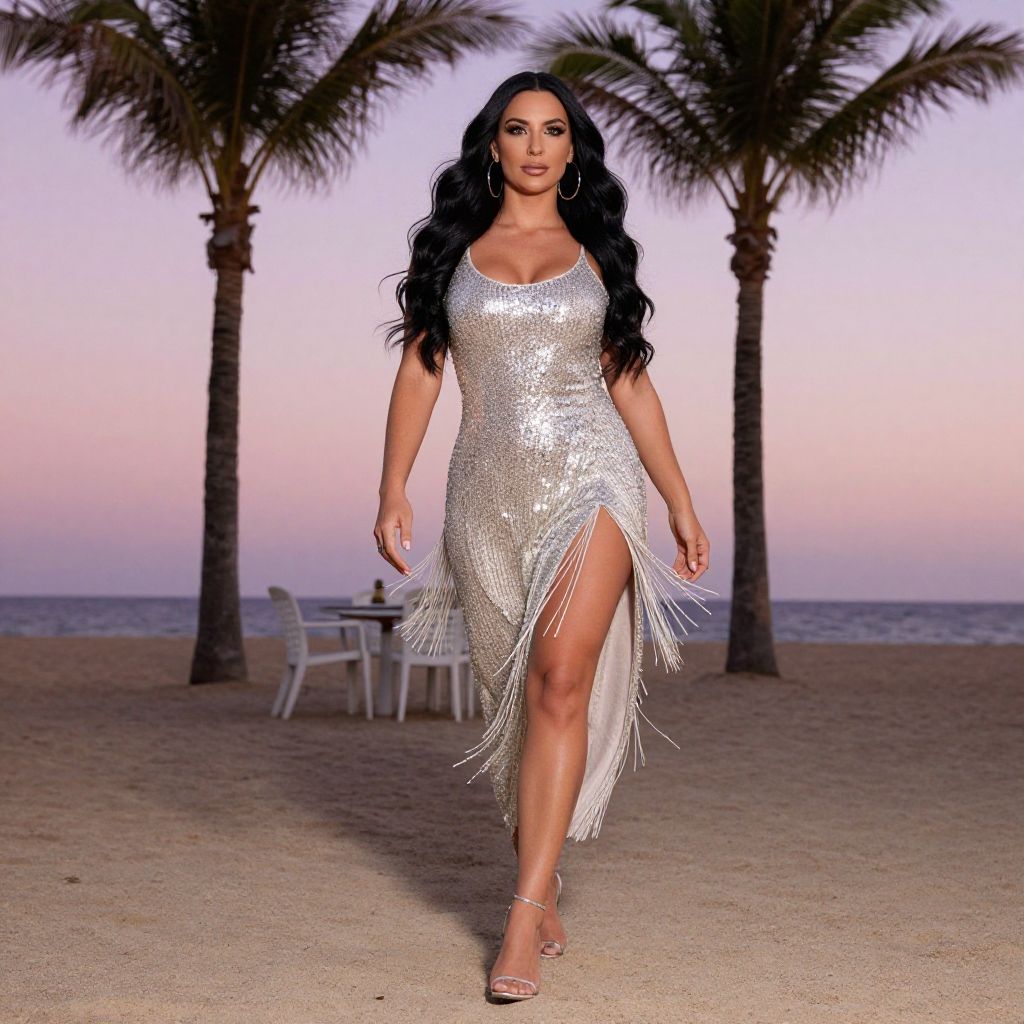 Photograph of a confident woman standing on a sandy beach. She's wearing a sheer black robe with floral patterns, revealing a black one-piece swimsuit underneath. She has long, wavy black hair and is wearing white high-heeled sandals. The background shows beach chairs, tables with umbrellas, and the ocean with gentle waves. She's standing with one leg slightly forward, looking directly at the camera.