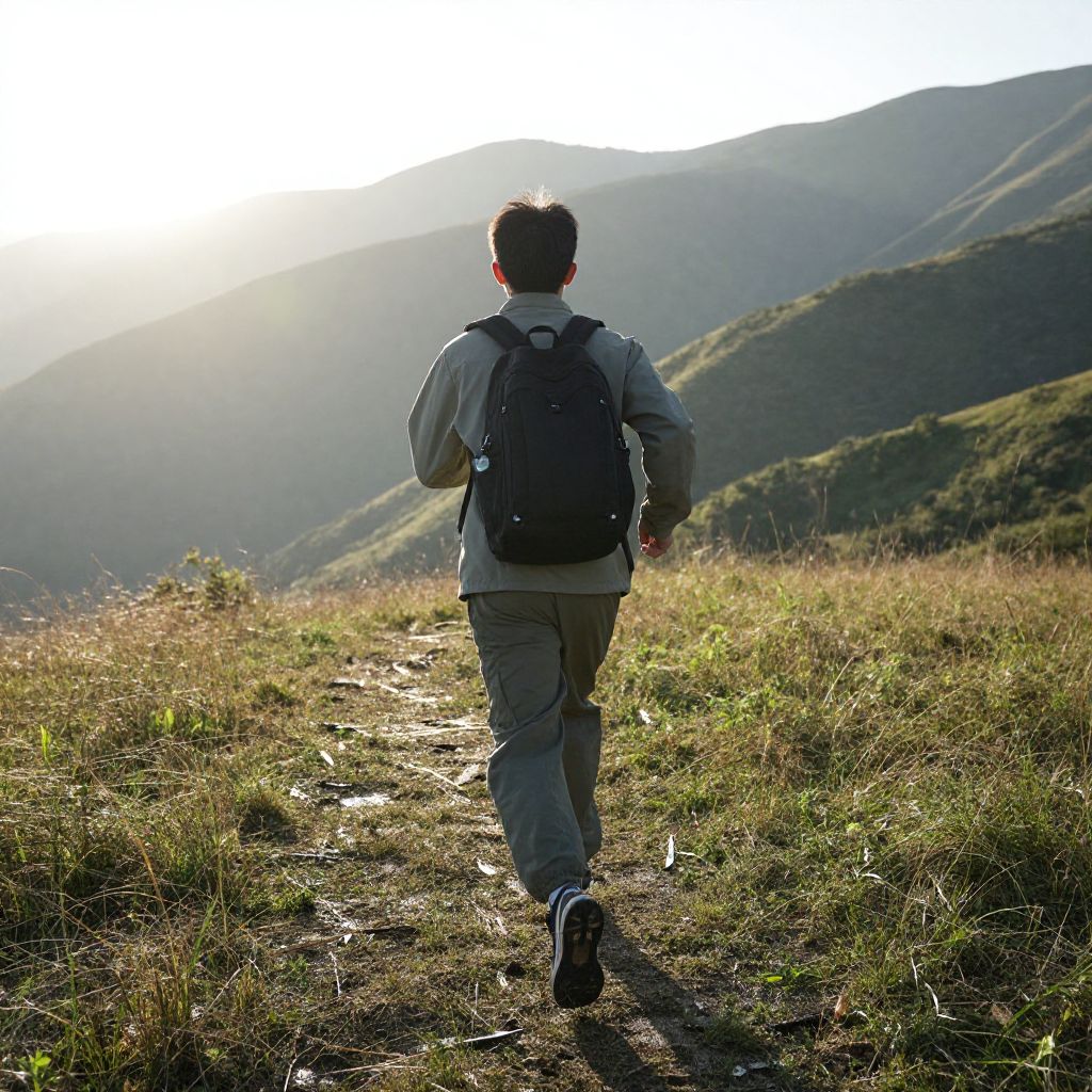 Photograph of a man with short dark hair, wearing a light gray jacket, gray pants, and a black backpack, walking away from the camera on a sunlit, grassy mountain trail. The sunlight is bright, casting long shadows and illuminating the rolling green hills in the background. The path he walks on is uneven, with patches of grass and dirt. The man's back is to the camera, and his stance is casual. The sky is clear, and the light creates a serene, early morning or late afternoon atmosphere.