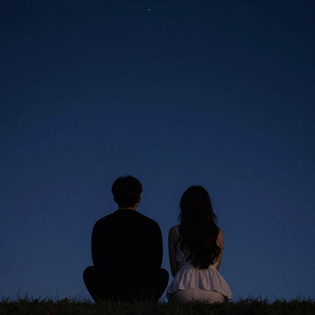 Silhouetted man and woman sitting together on grass under a clear, dark blue night sky filled with stars. The man is wearing dark clothing and has a broader build, while the woman has long, wavy hair and is dressed in a light-colored outfit. The scene conveys a serene, romantic atmosphere as they gaze at the starry sky.