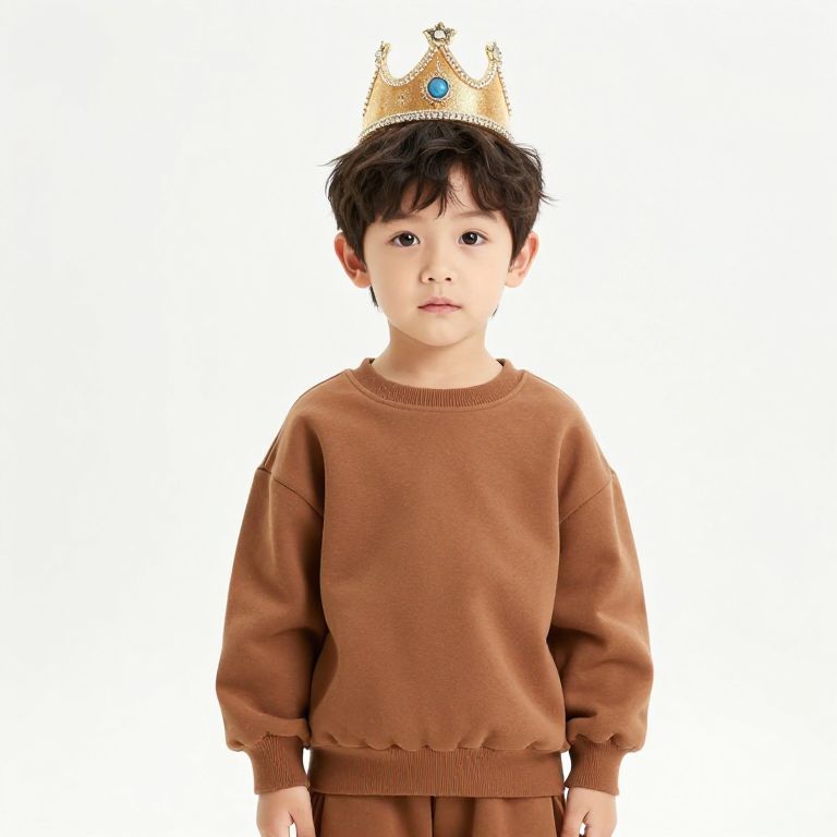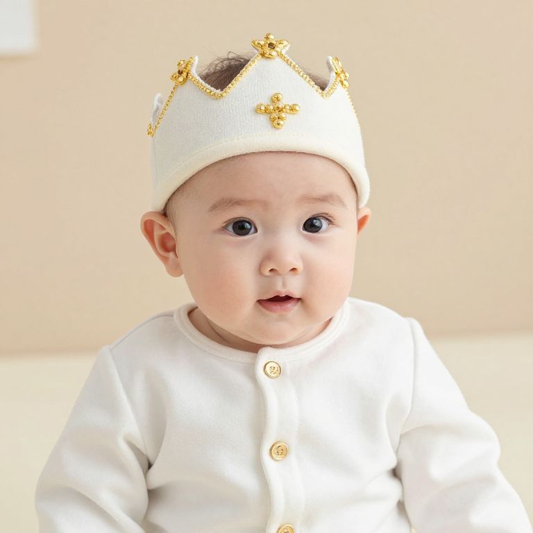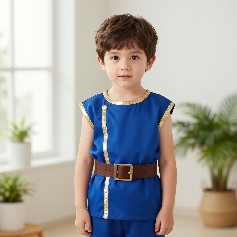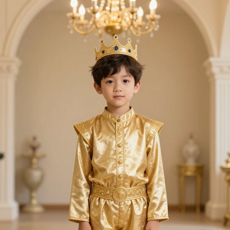 A young boy is wearing a white outfit with a gold belt and a crown on his head. He is wearing black sandals and has a gold necklace on his neck.