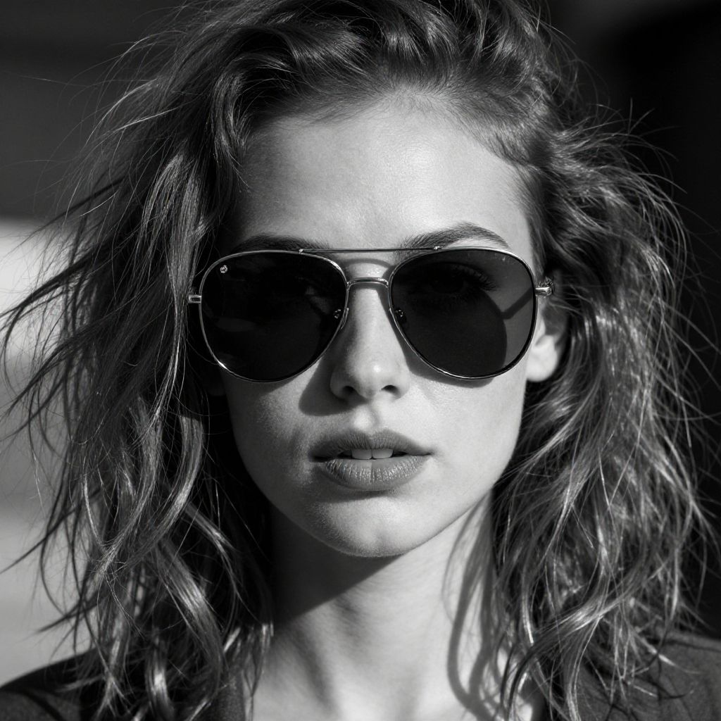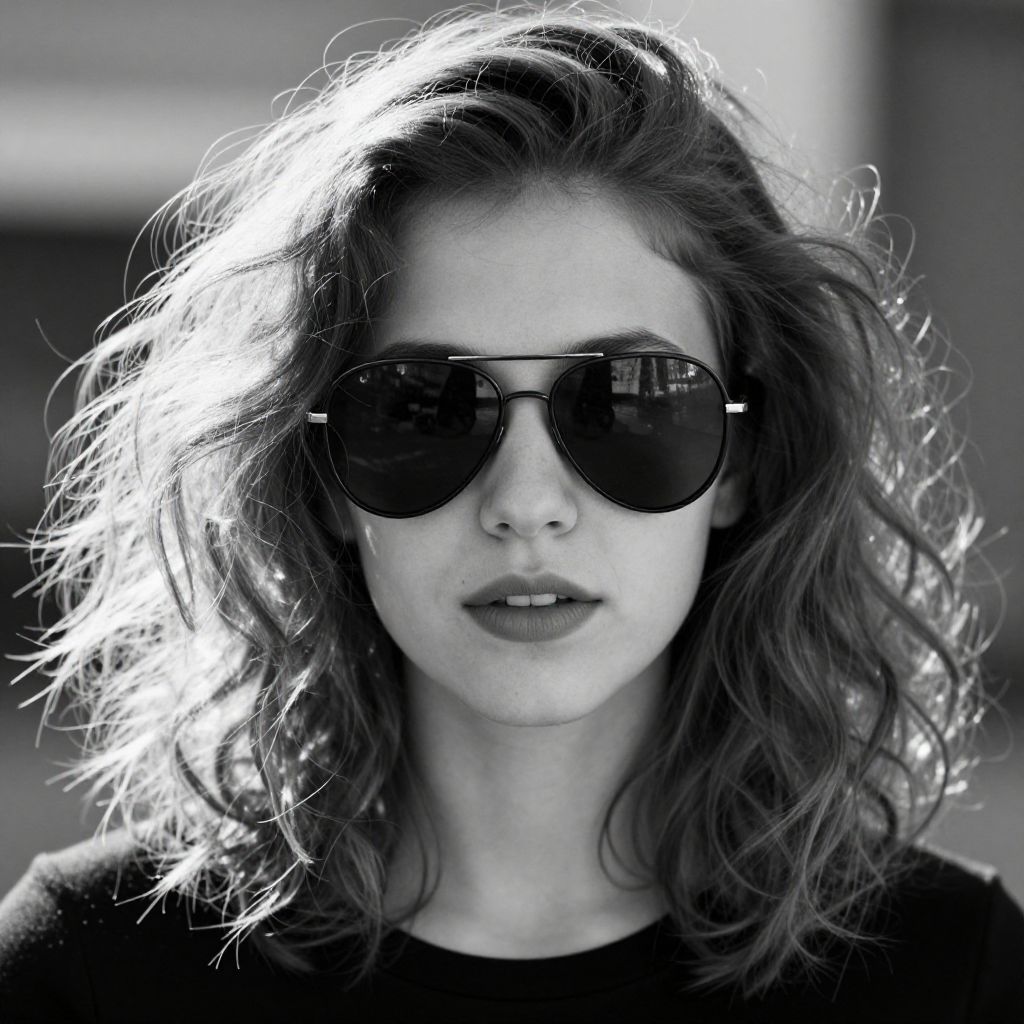 Black and white photo of a beautiful woman with tousled, wavy hair. She's wearing dark, oversized aviator sunglasses that cover her eyes, giving her a mysterious look. She has full lips and a slightly freckled face. Her expression is neutral, with a hint of allure. The background is blurred, focusing attention on her face. The lighting is dramatic, highlighting her features and creating shadows.