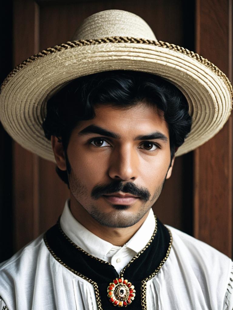 Spanish national costume, 1boy, male focus, solo, looking at viewer, facial hair, hat, black hair, white shirt, mustache, realistic, shirt, long sleeves, black eyes