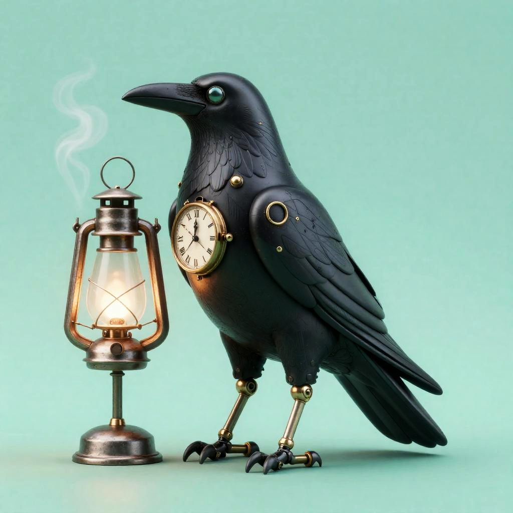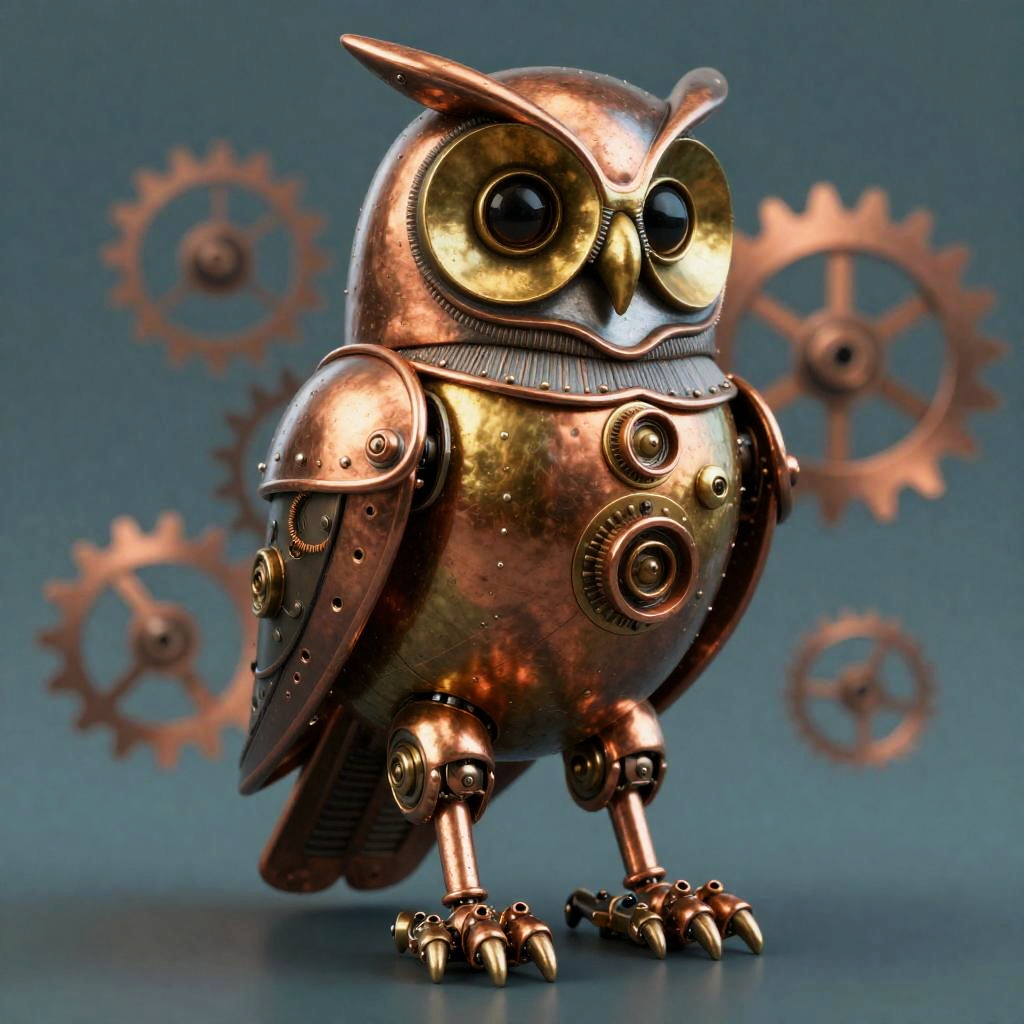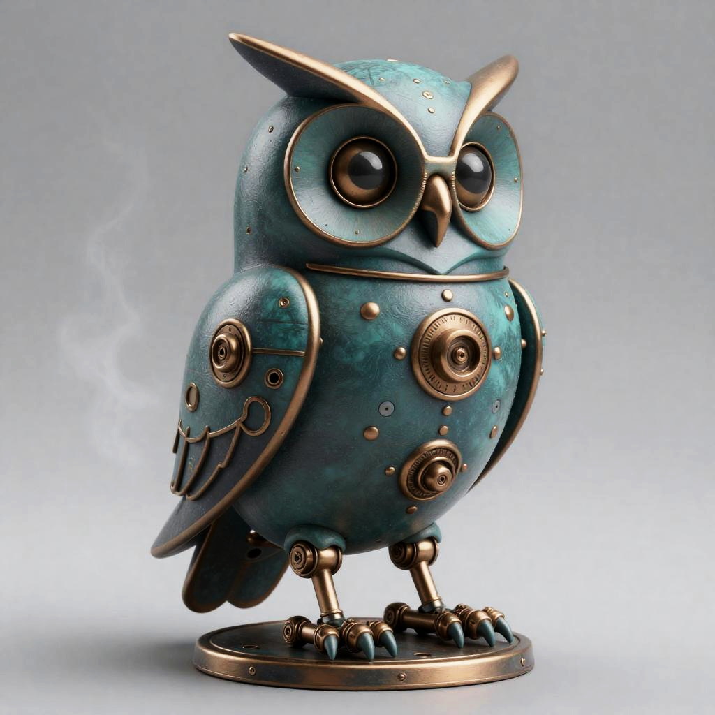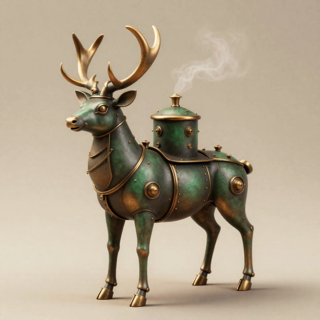 A detailed illustration of a steam-powered stag automaton with patina green and antique brass finish. The three-quarter view showcases its mechanical joints, sepia rim lighting, and drifting steam emanating from a cylindrical boiler on its back, creating a soft volumetric haze. This steampunk-inspired piece combines modern and classic artistry with high-definition rendering.