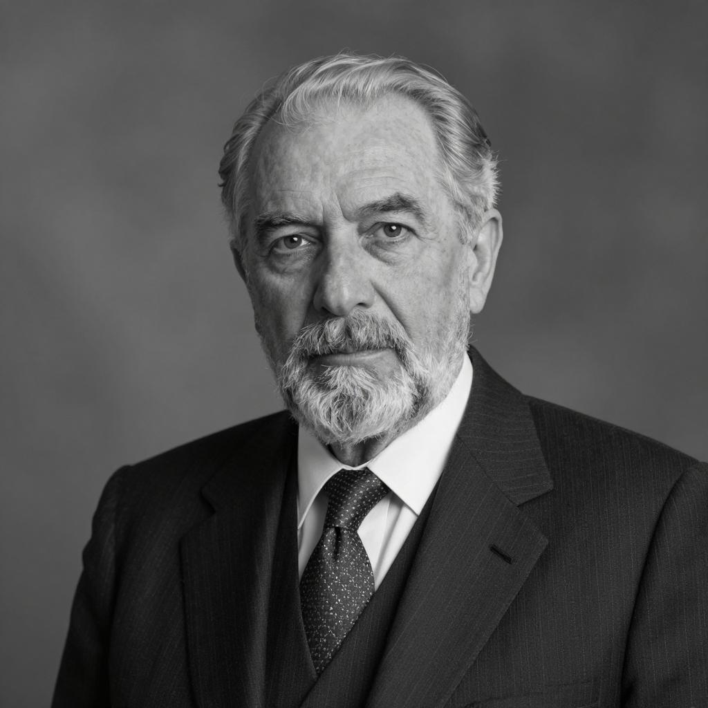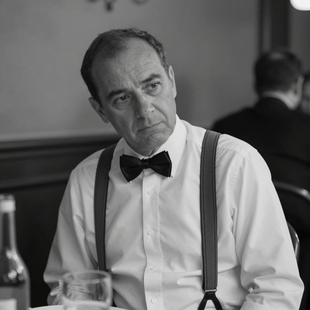 Black and white close-up photograph of a middle-aged man with a mustache. He wears a dark suit and white bow tie. His expression is serious and slightly skeptical, with a slight frown. Background is blurred. Man's face occupies the center of the frame. One visible eye is slightly squinted.