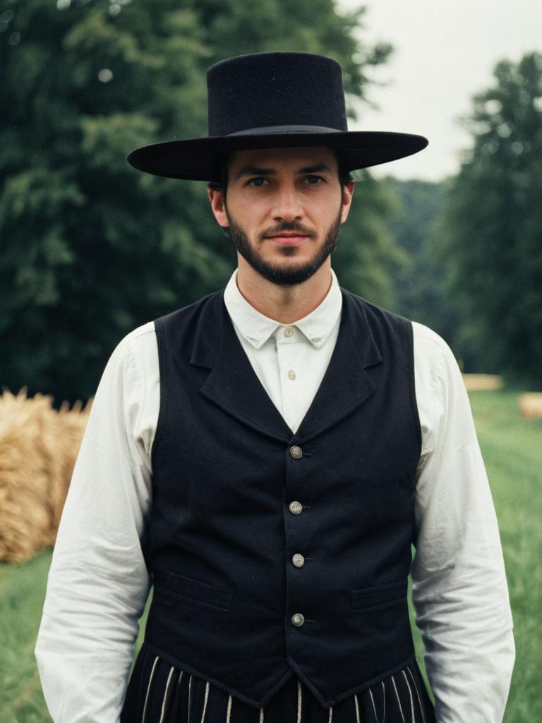 Man in Amish costume, photorealistic cosplay photography, authentic look
