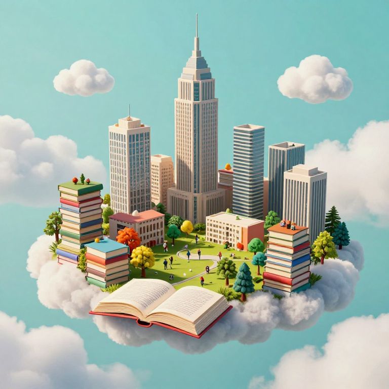 Books form a whimsical floating cityscape, with towering stacks resembling skyscrapers and open volumes serving as vibrant parks, all nestled atop fluffy clouds against a serene turquoise sky.
