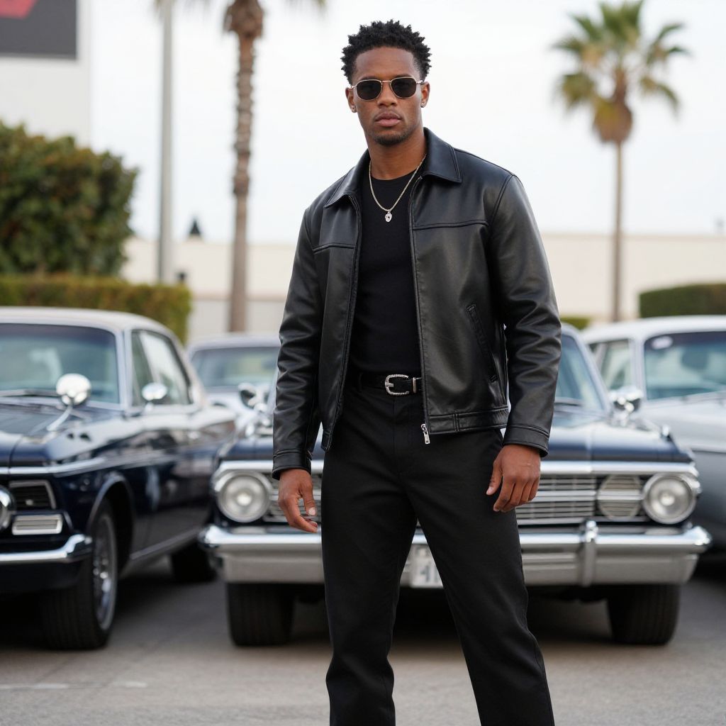 Photograph of a tall, muscular Black man with short, curly black hair and dark sunglasses. He wears a black leather jacket over a black shirt and black pants, with a silver necklace. His expression is serious and confident. Behind him are several vintage black and silver cars parked in a row, with blurred palm trees and a white building in the background. The image has a sharp focus on the man, with a slightly blurred background, highlighting his stylish, urban look.