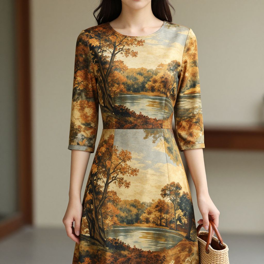 A woman elegantly showcases a vintage-inspired round-neck half-sleeve dress featuring a detailed autumn scenery print, blending natural elements like trees, a serene lake, and warm golden hues with a retro aesthetic, complemented by a woven basket bag for a chic party or Christmas look.
