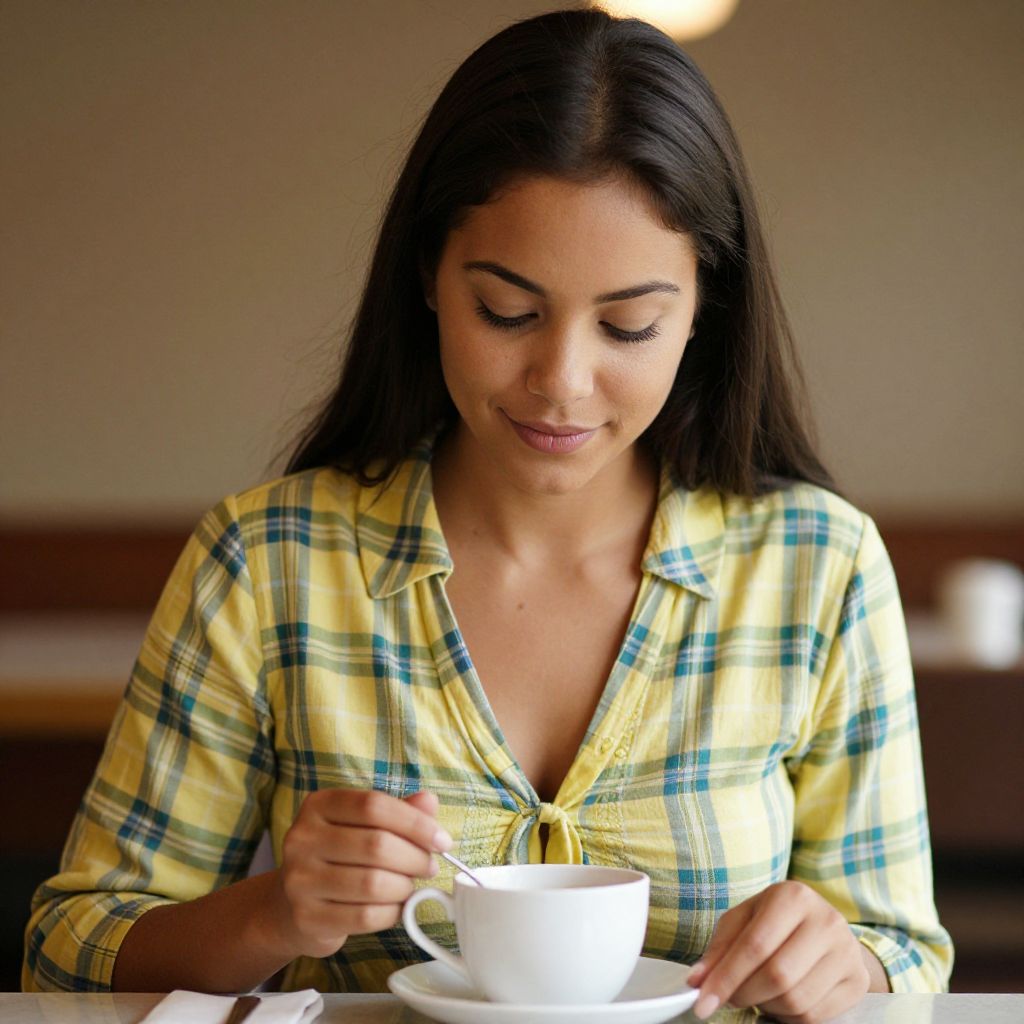 Photograph of a young woman with long, dark brown hair and a light brown complexion, wearing a yellow and green plaid shirt with a deep V-neck. She's sitting at a table, focused on a white teacup and saucer in front of her, gently holding a spoon. The background is blurred, with warm, indoor lighting. She has a subtle, content smile.