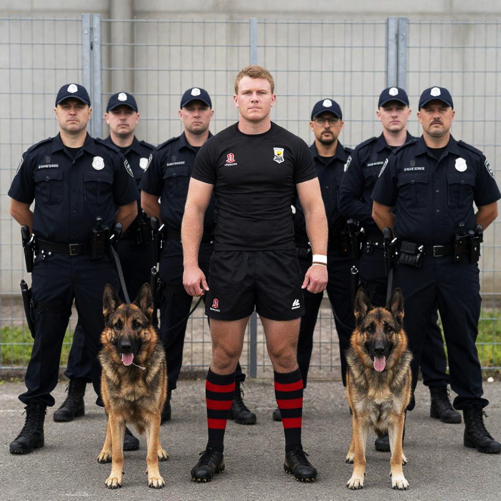 Photograph of a male rugby player in black uniform and red-striped socks, standing center, flanked by six police officers in black uniforms with hats. Two German Shepherds, one on left and one on right, are on leashes. Metal fencing and concrete wall in background. Player's expression is serious, officers' expressions neutral.