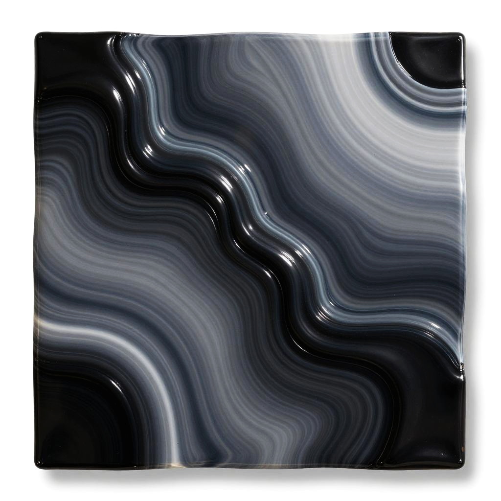 Latex transformation, abstract art piece showing fluid dimensions shifting into a latex texture, vibrant color palette with black and silver hues, smooth gradients, futuristic minimalism