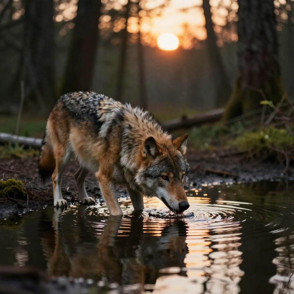 A lone wolf drinking water in a quiet woodland pond at twilight, soft glowing hues of sunset in the background, calm water surface with gentle ripples, detailed natural habitat, evocative and peaceful wilderness image.