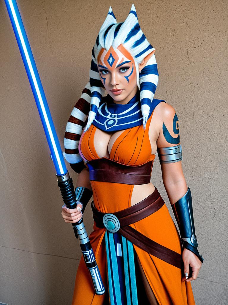 Photo-realistic cosplay photo of person in ahsoka tano costume. 1girl, orange skin, lips, blue eyes, tentacle hair, medium breasts, large breasts, facial tattoo, alien, togruta, jedi, lightsaber. full body shot