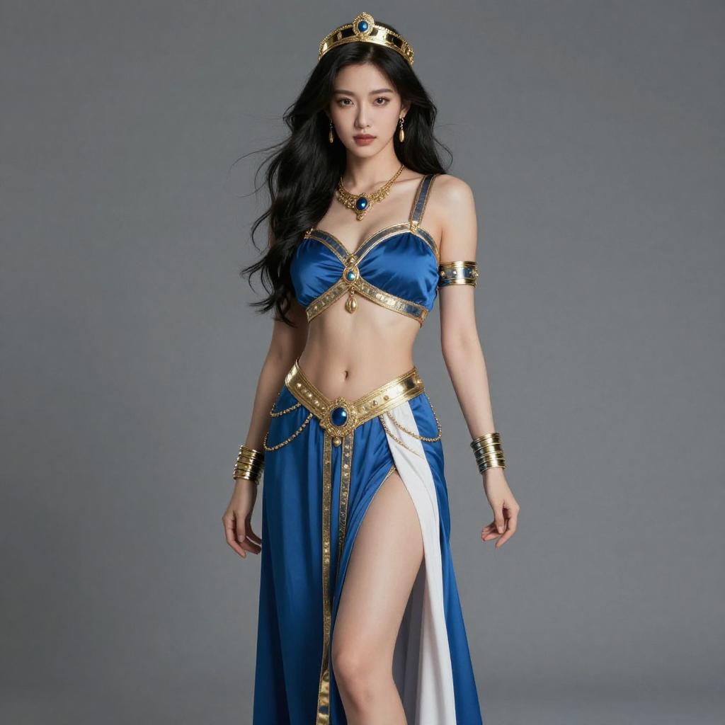 Photograph of a red-haired woman with fair skin, wearing an elaborate, teal and gold, low-cut, traditional Asian-style dress with intricate embroidery. She has a confident pose, with one hand raised, and is adorned with a gold necklace and earrings. The background is dimly lit with a yellow arch and dark foliage.