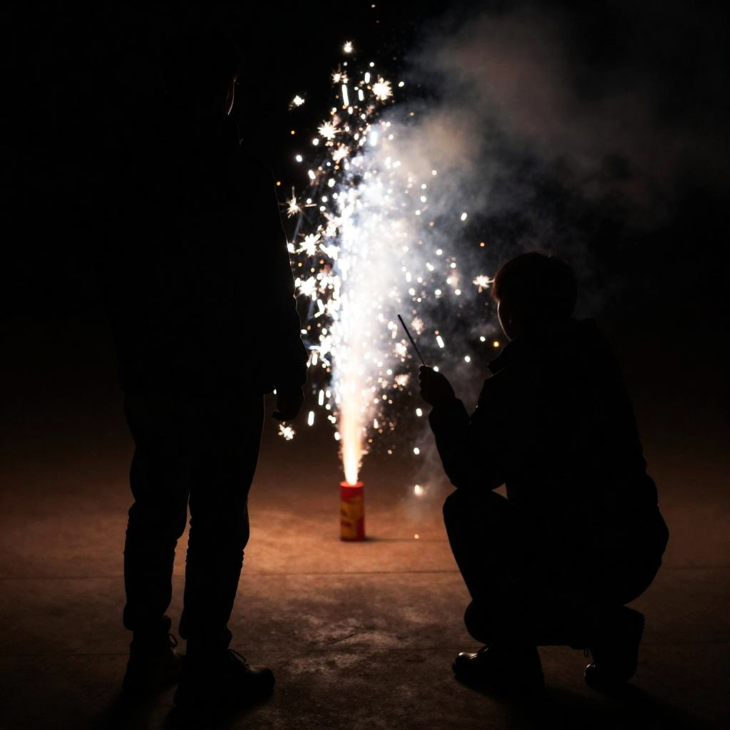 Photograph of two silhouetted figures in dark clothing, one standing with back to camera, other kneeling, both holding sparklers. Bright, fiery sparks emanate from sparkler in center. Smoke fills the dimly lit background. Intense light from sparkler.