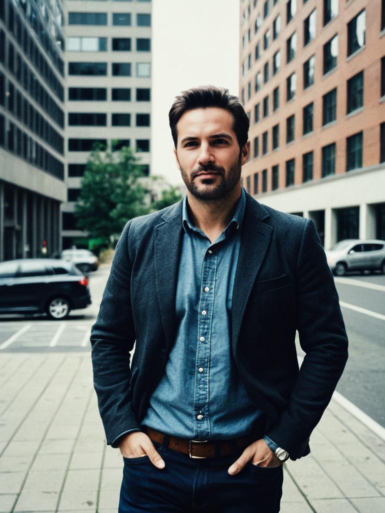Man in Casual Office Outfit, photorealistic outdoor portrait in urban setting