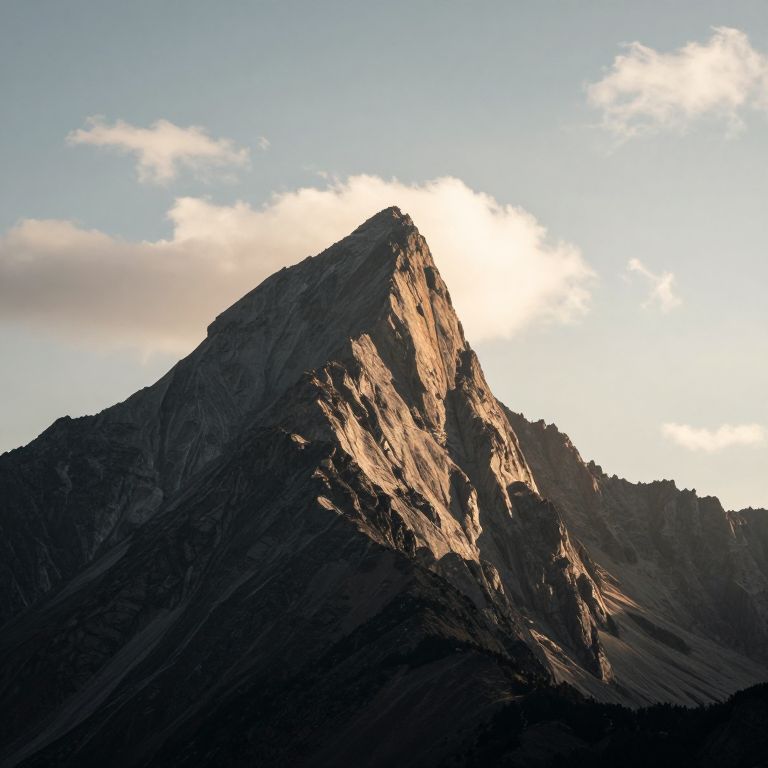 Dramatic sunlight bathes a towering, jagged mountain peak, casting deep shadows across its rugged slopes and highlighting its imposing form against a soft, hazy sky dotted with wispy clouds.