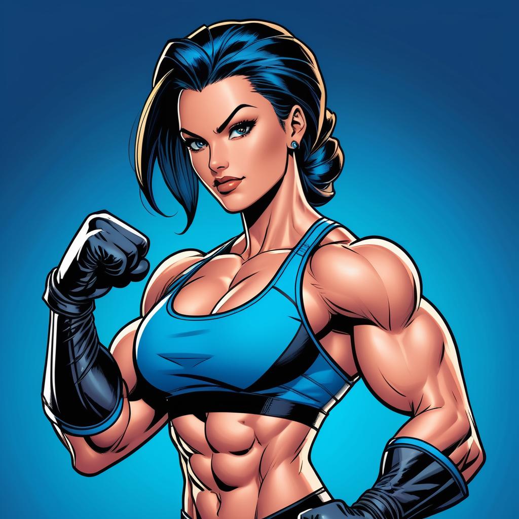 A muscular woman flexing her arms confidently, wearing a sports bra and gloves, comic book style with bold outlines and dynamic shading, vibrant blue and black colors, intense lighting highlighting muscle definition, simple gradient background