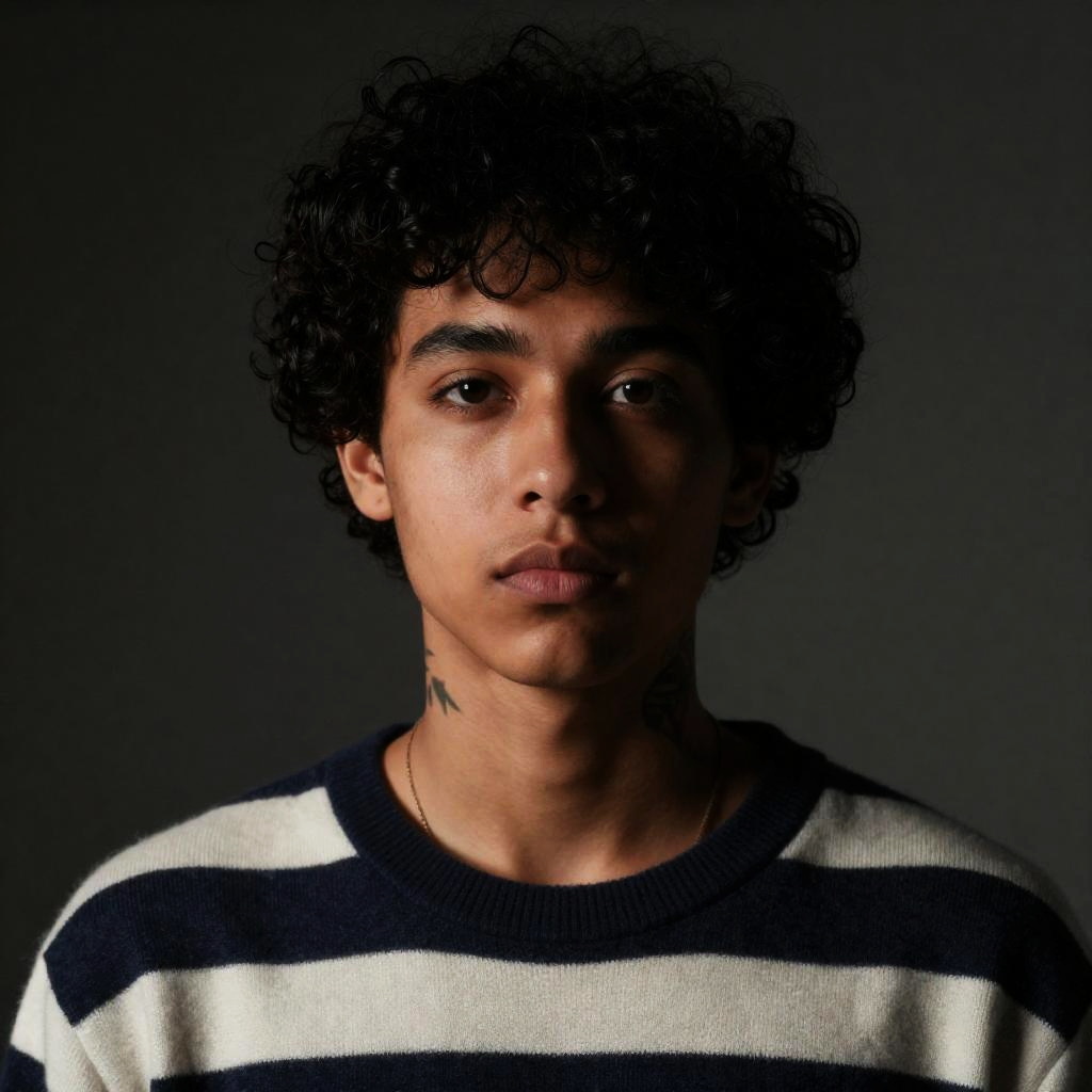 Close-up portrait of a young man with curly black hair, wearing a navy blue and white striped sweater. The subject has a tattoo visible on his neck and looks directly at the camera with a neutral expression. The image features beautiful lighting with deep shadows on a dark background.