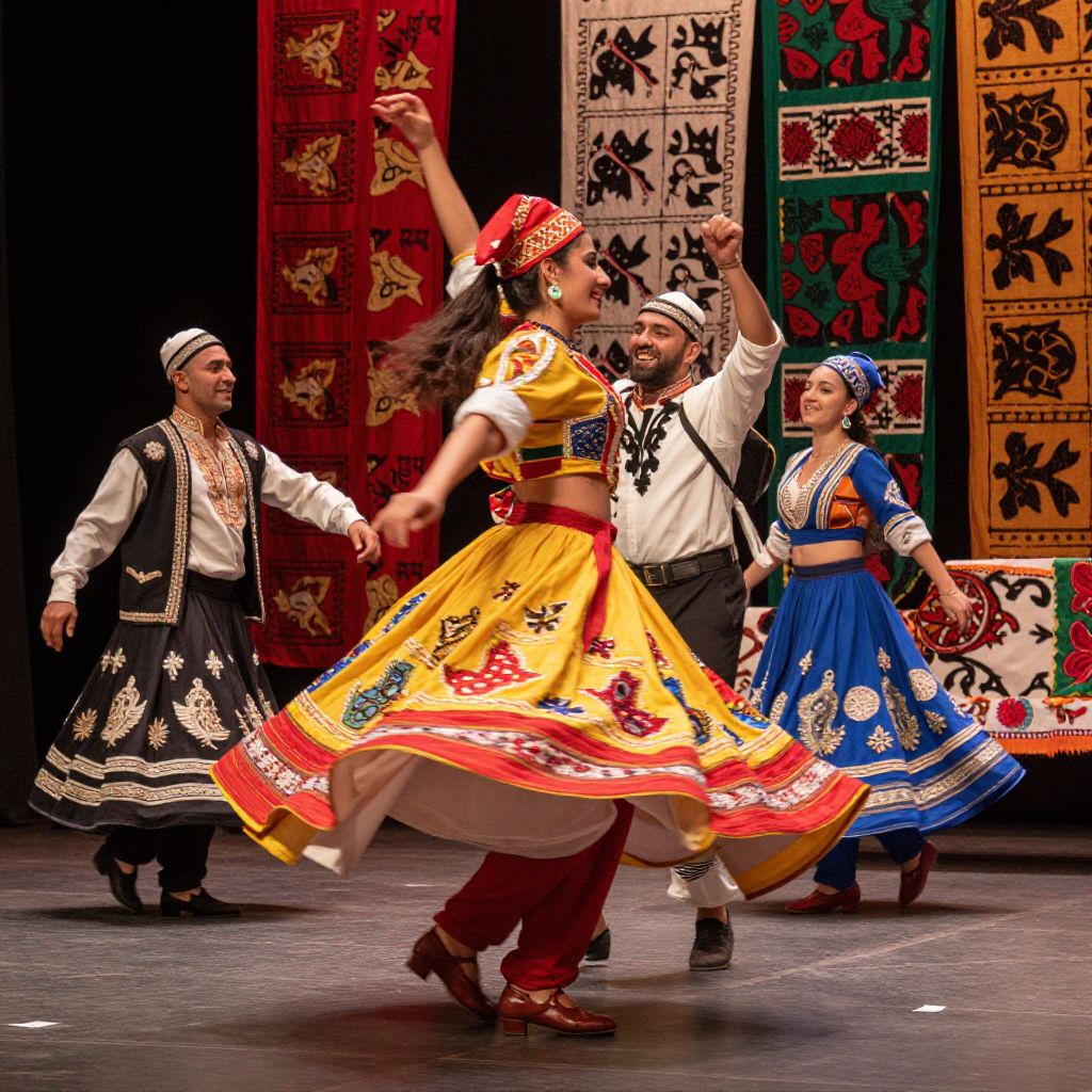 Lebanese dance performance with men and women in colorful traditional garments, swirling movement captured mid-motion, energetic expressions, vibrant stage draped with embroidered fabrics, dramatic lighting highlighting dynamic choreography and cultural celebration.