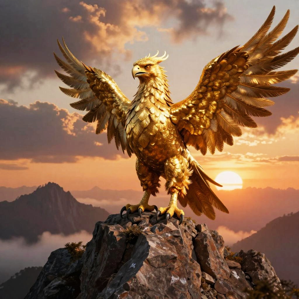 Golden eagle with outstretched wings standing on a rocky mountain peak at sunset, illuminated by warm orange and pink sky.