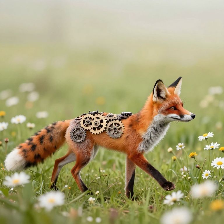 In a meadow where time weaves its own erratic dance, a clockwork fox strides with purpose, its gears whispering the rhythm of eternity amidst the soft hum of daisies and the fleeting whispers of dawn.