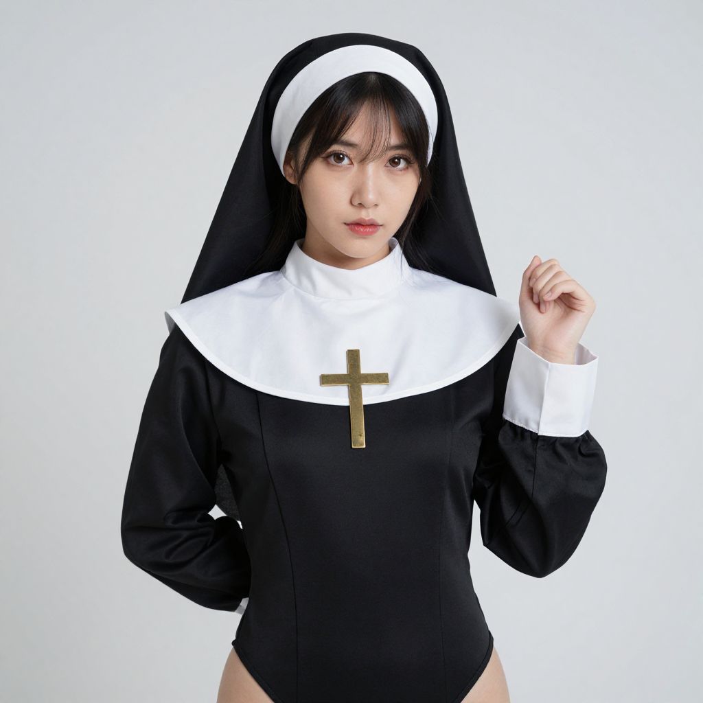 Woman Sinfully Nun Costume, woman in a nun's outfit with a cross on her chest