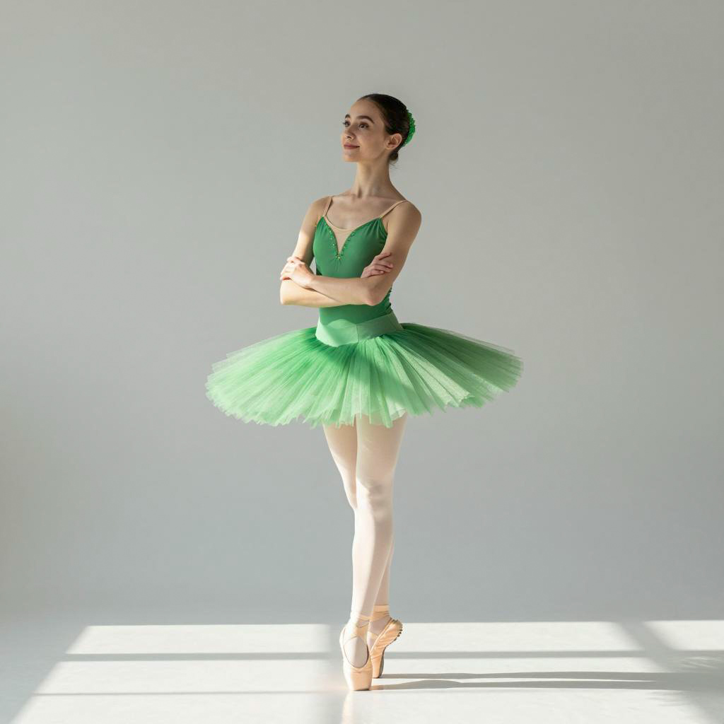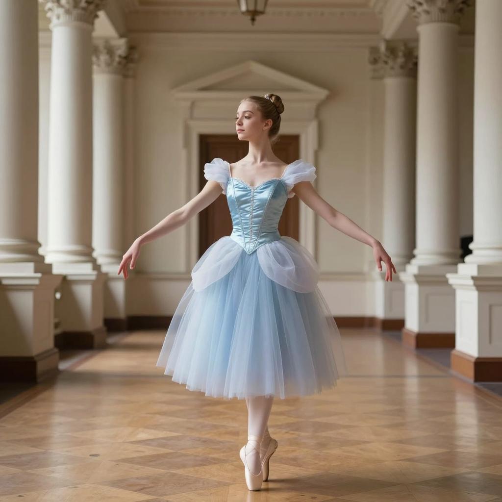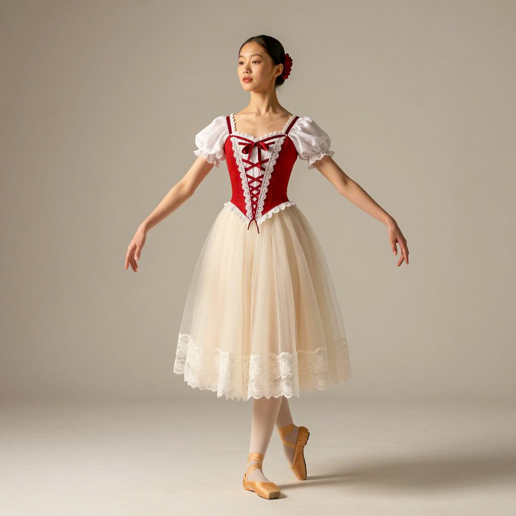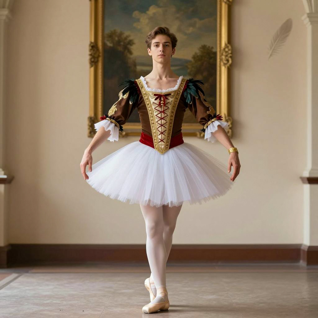 Ballet costume male, photorealistic, young male ballet dancer, standing, full body, wearing ornate baroque-style dance costume, brown corset with gold and cream embroidery, white tulle skirt, red sash, shoulder feathers, gold wristbands, brown hair, short, neat, clean-shaven, neutral expression, soft natural light, beige wall with subtle feather patterns in background, framed painting in background, symmetrical composition, classical ballet aesthetic, warm color palette