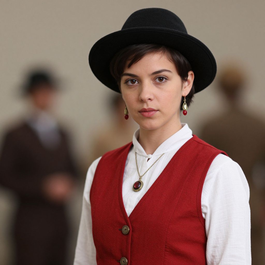 A photograph of a young woman with fair skin and short dark hair, wearing a black wide-brimmed hat and a red sleeveless vest over a white shirt. She has red earrings and a pendant necklace with a circular medallion. Her expression is serious, and she gazes directly at the camera. The background is blurred, featuring two indistinct figures in brown and beige attire, suggesting an indoor setting. The image has a slightly vintage, realistic style.