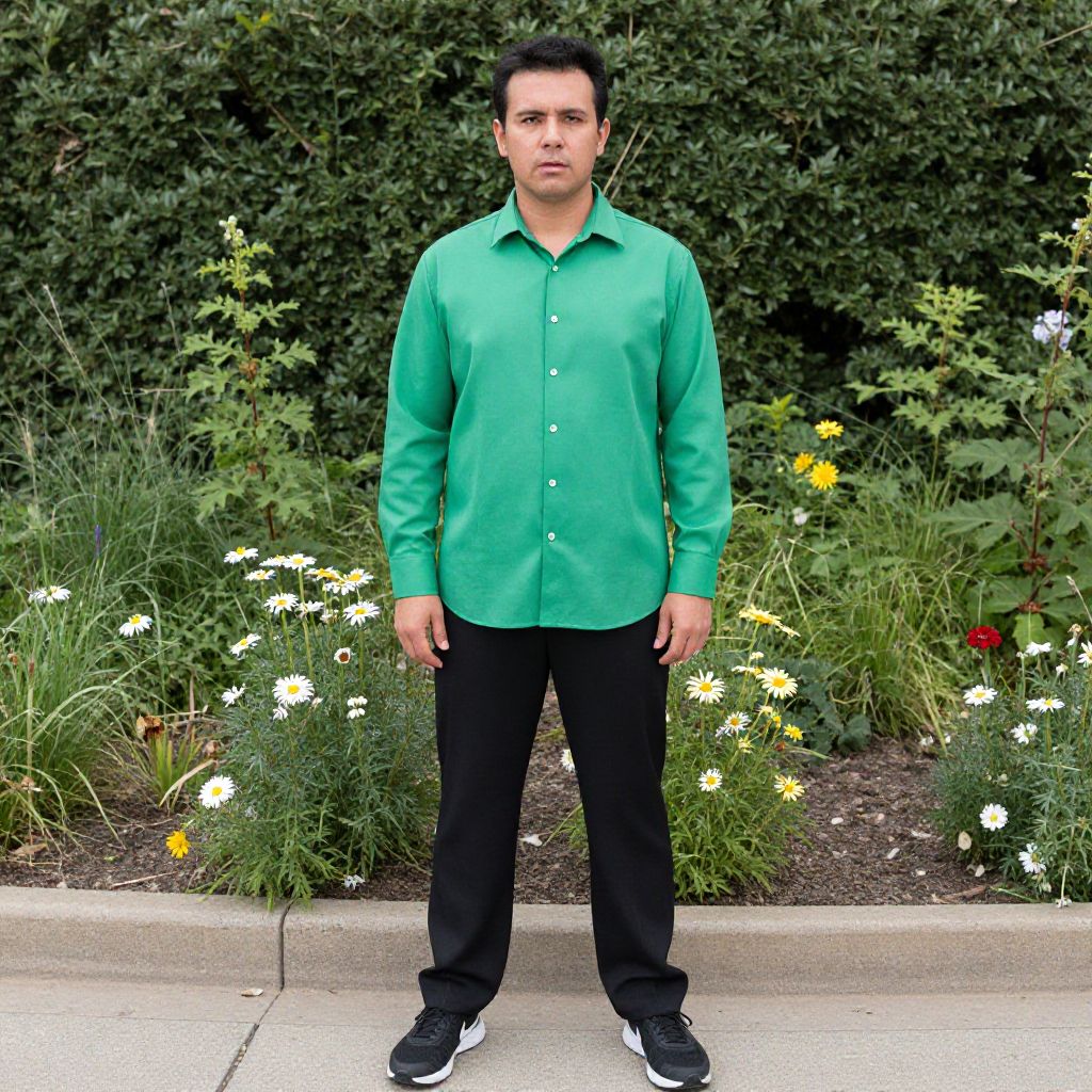 "Work Appropriate Poison Ivy Costume, man in a green shirt and black pants standing in front of a flower garden"