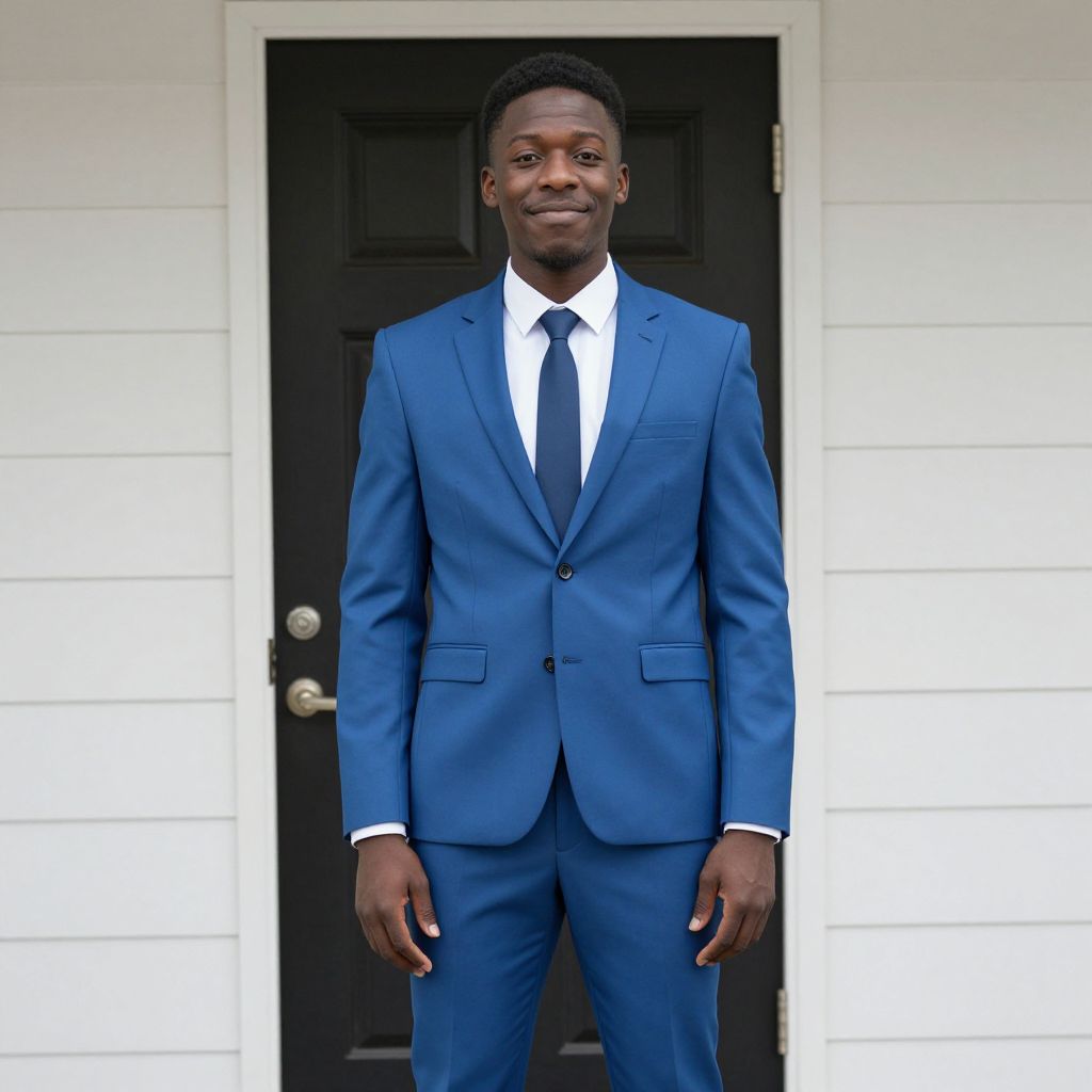 Funny Black Costume, dressed in a blue suit standing in front of a door