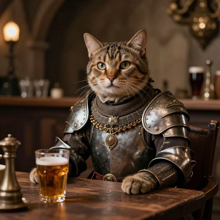 Photograph of a tabby cat wearing medieval-style silver armor, complete with a chainmail shirt and ornate pendant, sitting at a wooden table in a dimly lit tavern. The cat has green eyes and a focused expression. In front of the cat is a glass of amber beer with a foamy head. The background features blurred, warm lighting, wooden furniture, and a candle on a shelf. The scene combines whimsical and historical elements, creating an intriguing and humorous contrast.