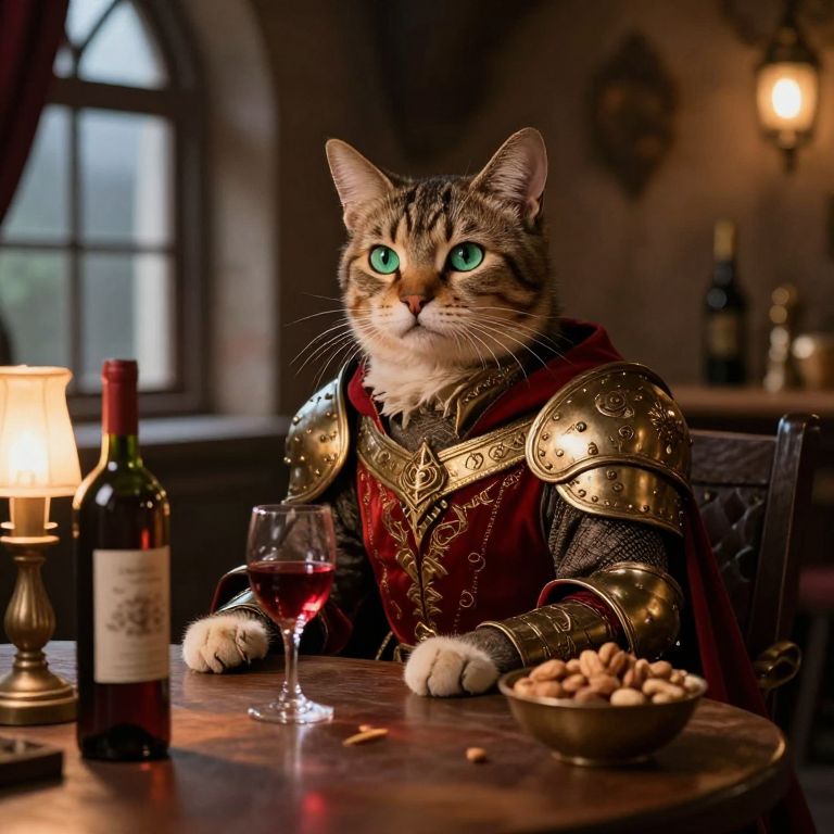 A regal feline figure dressed in ornate medieval armor sits at a table adorned with drinks, in a beautifully detailed, hyper-realistic setting reminiscent of a medieval tavern.
