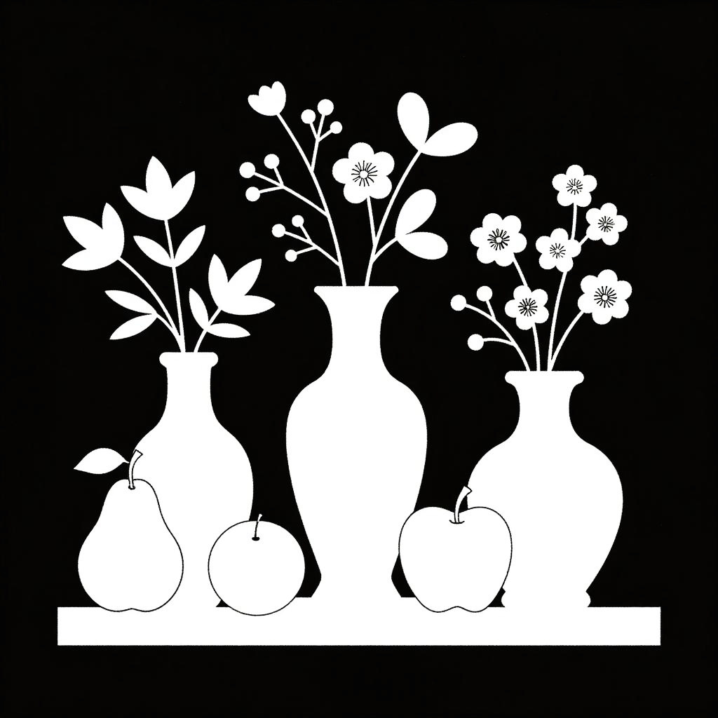 This is a black and white digital drawing of a still life arrangement. It features various white silhouettes of vases, flowers, and fruits on a black background. The flowers have delicate, branching leaves and small blossoms, while the vases come in different shapes and sizes. The fruits, including pears and apples, are scattered on a horizontal surface. The overall style is minimalist and elegant.