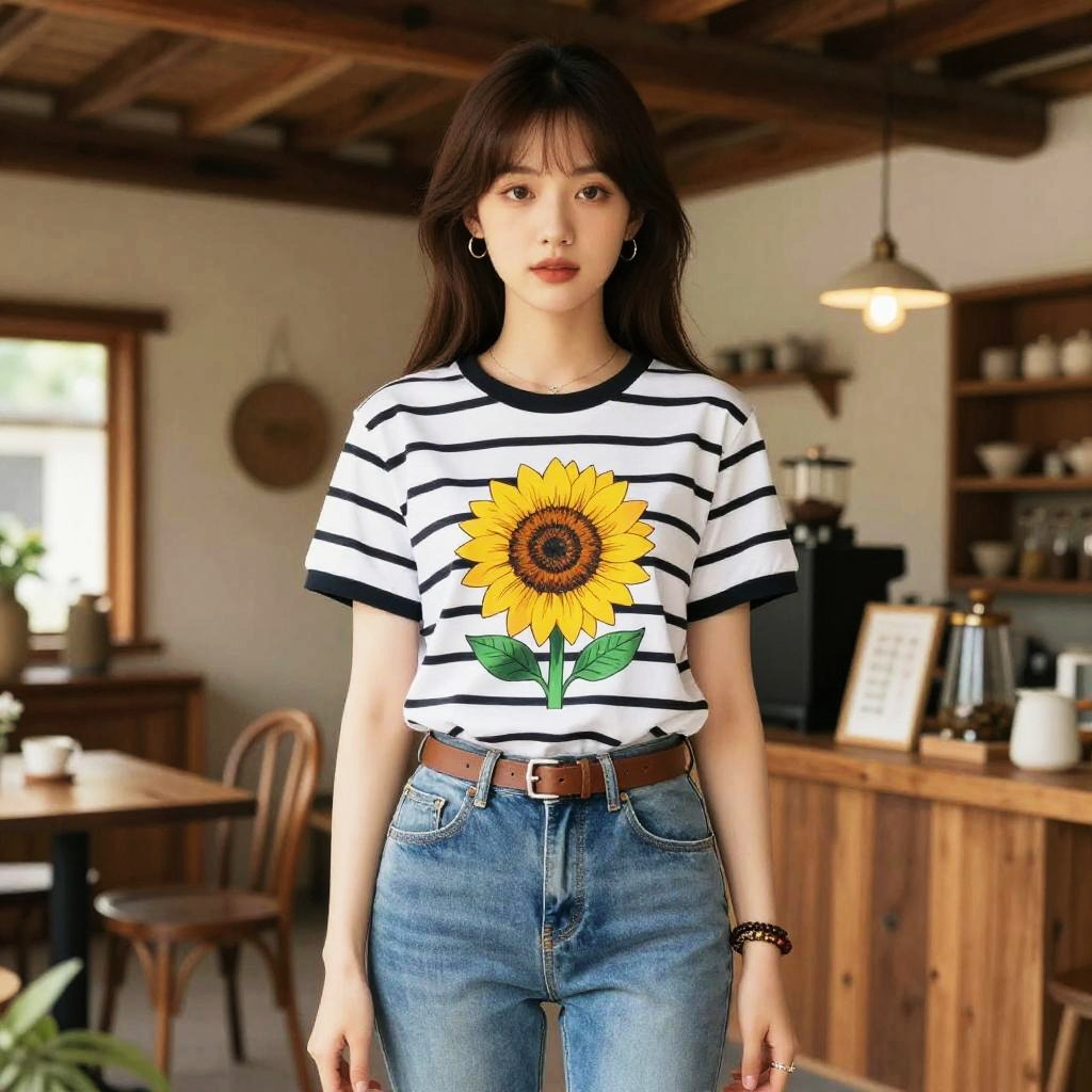 A willowy woman in casual streetwear, wearing a white t-shirt with black stripes and a sunflower graphic, tucked into faded blue skinny jeans, accessorized with a brown leather belt and beaded bracelets, stands in a rustic farmhouse tea room with wooden beams. The visual style is reminiscent of wit studio. Sexy. Pretty face and beutiful eyes