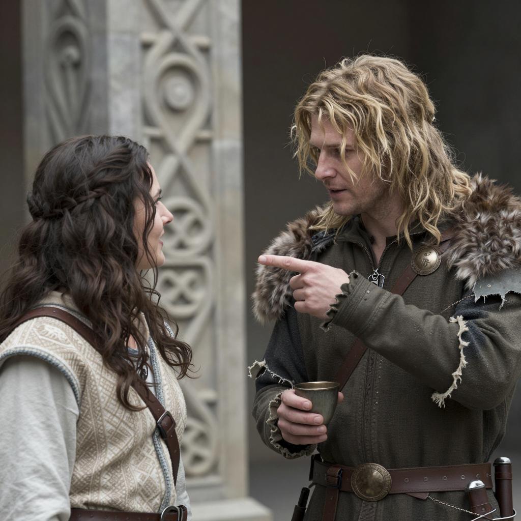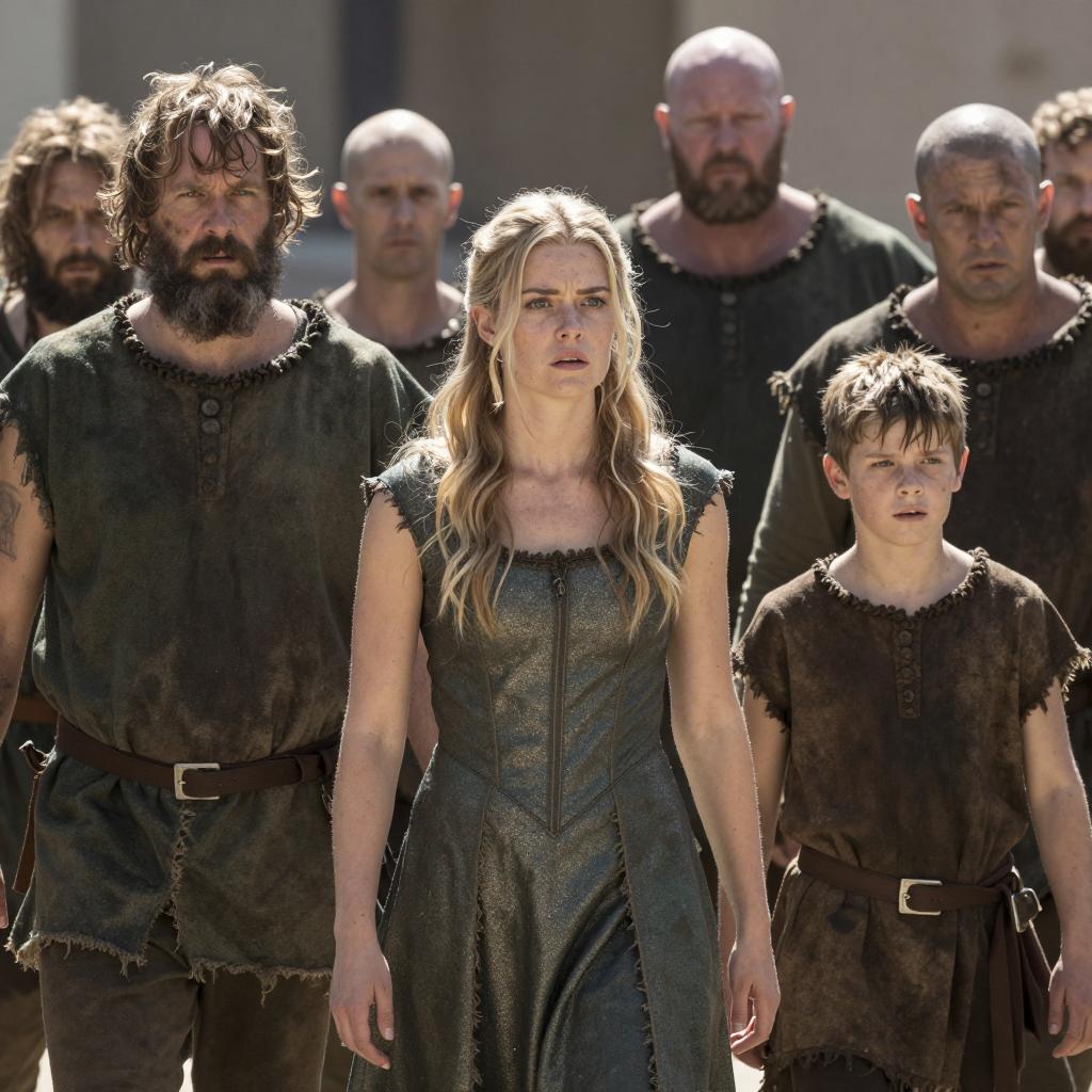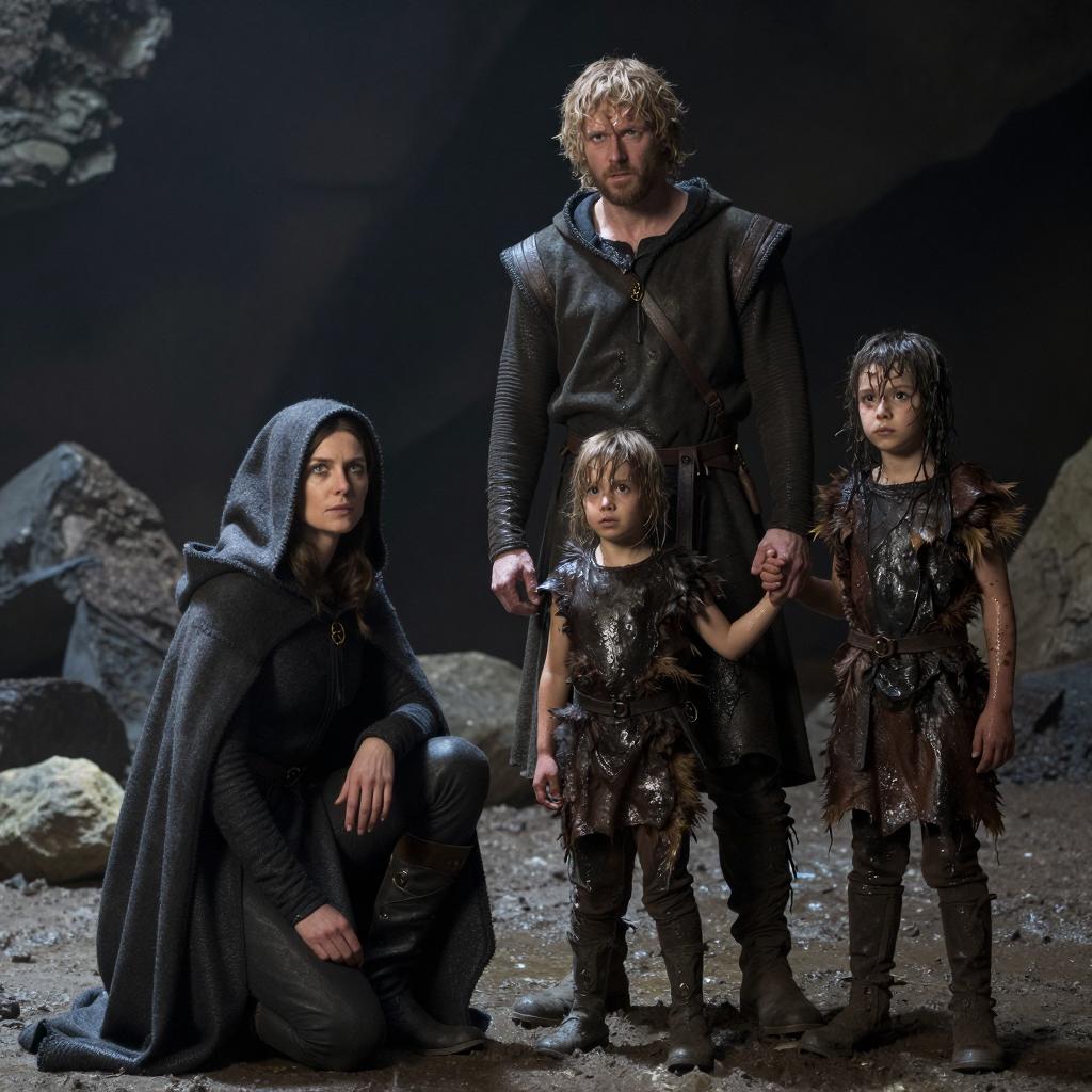 Photograph of a dark, cave-like setting with four people. A woman in medieval clothing with a hood, crouches beside a man and two children, covered in dark, wet fur-like material. The man stands, holding the child's hand. Soft light filters in from the left. Intense expressions. The background shows rocky, uneven terrain.