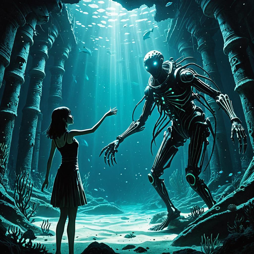 A robotic cephalopod, with tentacles made of metallic wires and glowing sensors, interacting with a fascinated cyberneticist, in a cluttered cyber-lab filled with tools and holograms, depicted in the surreal and dark anime style of Q Hayashida.