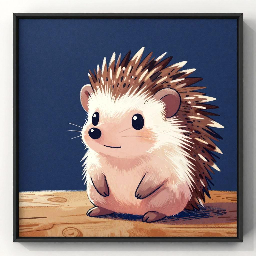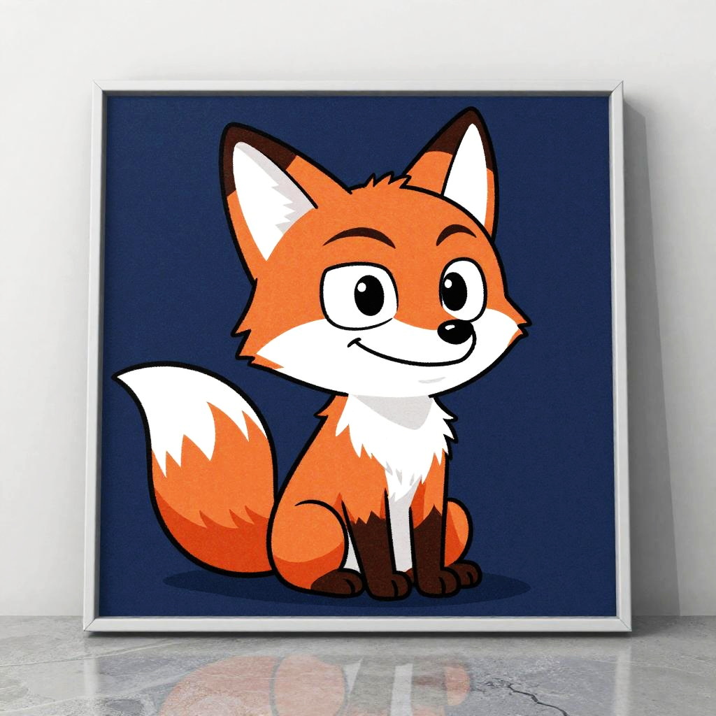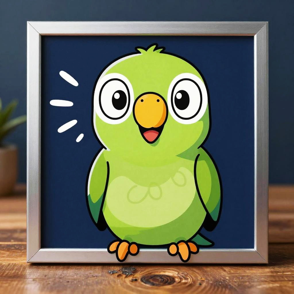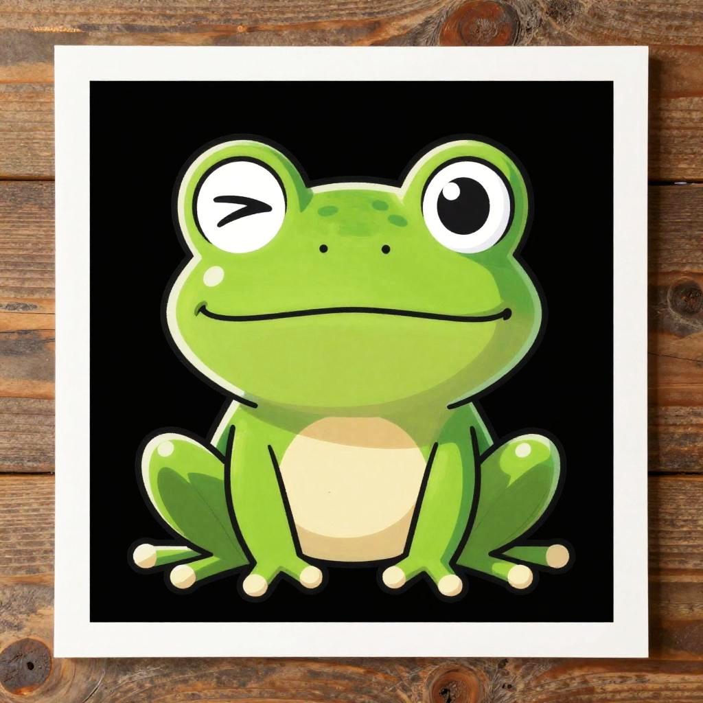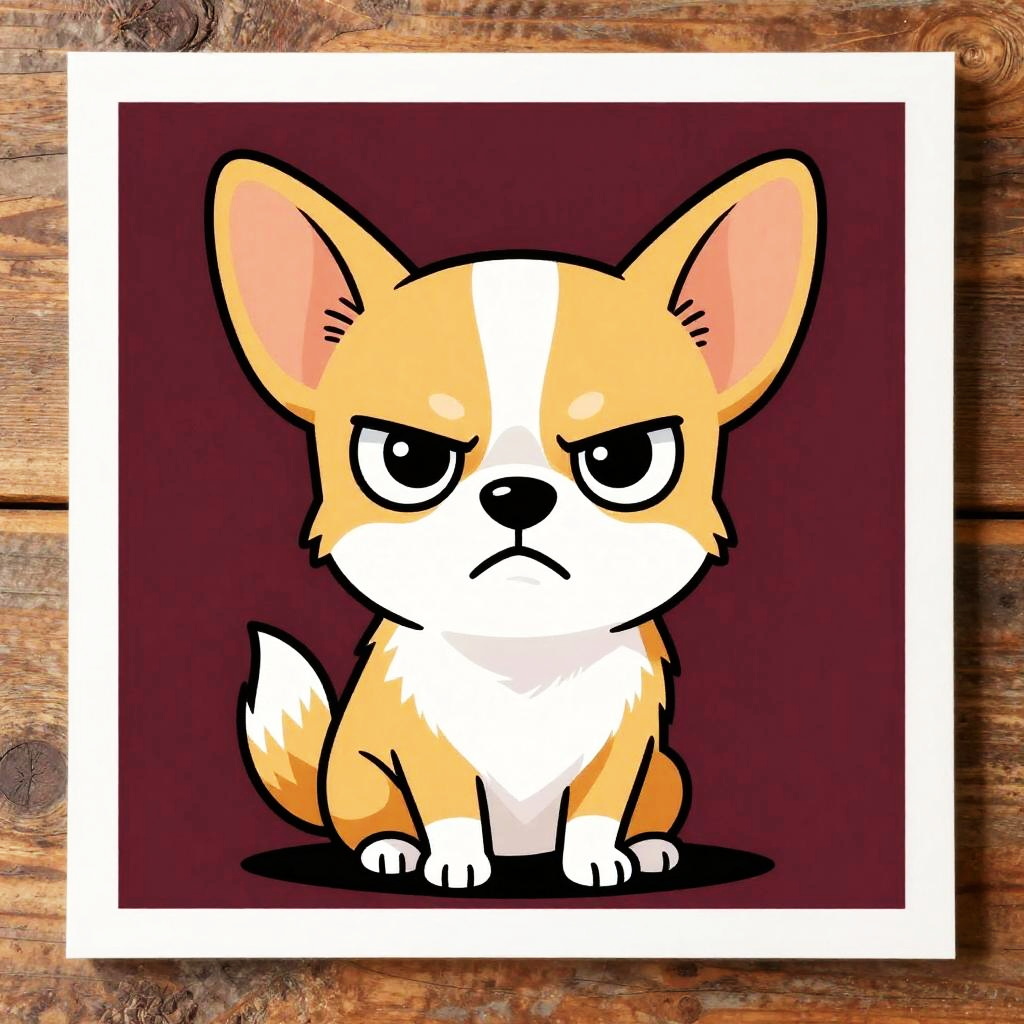 This is a digital drawing of a cartoon dog, with a happy chuckle and large, rectangular eyes for a quirky look. Bright colors with crisp white accents along the face and edges. The character sits against a muted forest green background, bordered by a clean white frame and placed on a rustic wooden tabletop. Rendered in a polished aesthetic with paper grain aesthetic with subtle paper grain, bold linework, and a soft vignette.