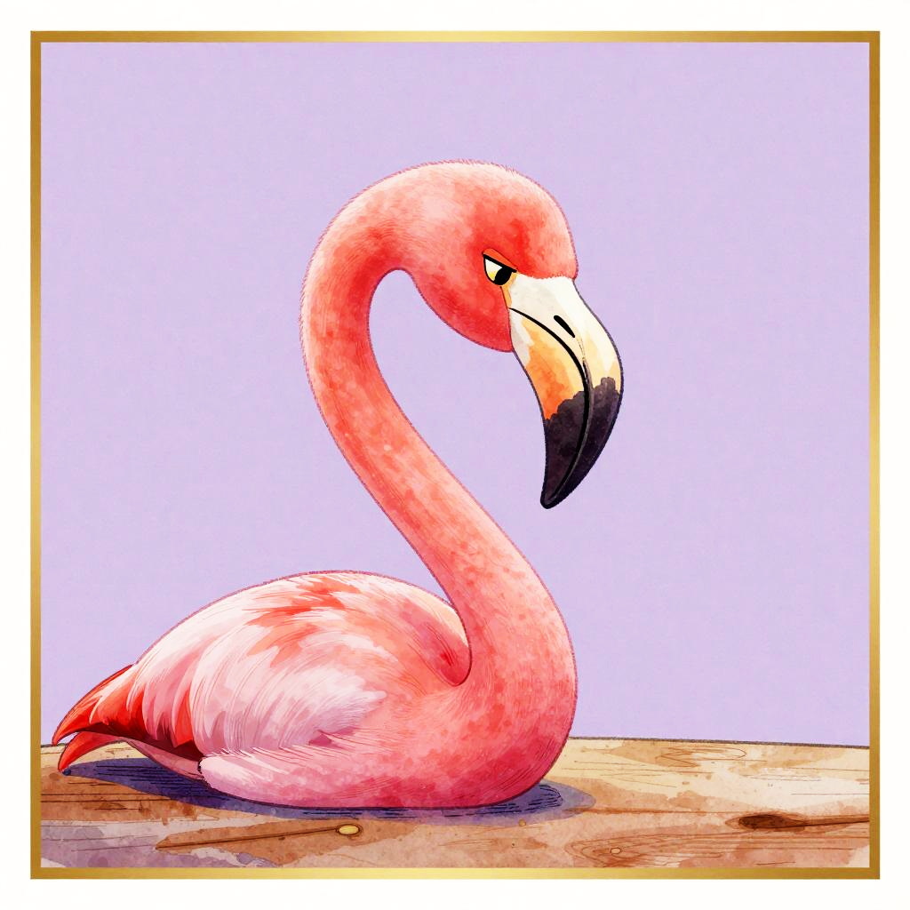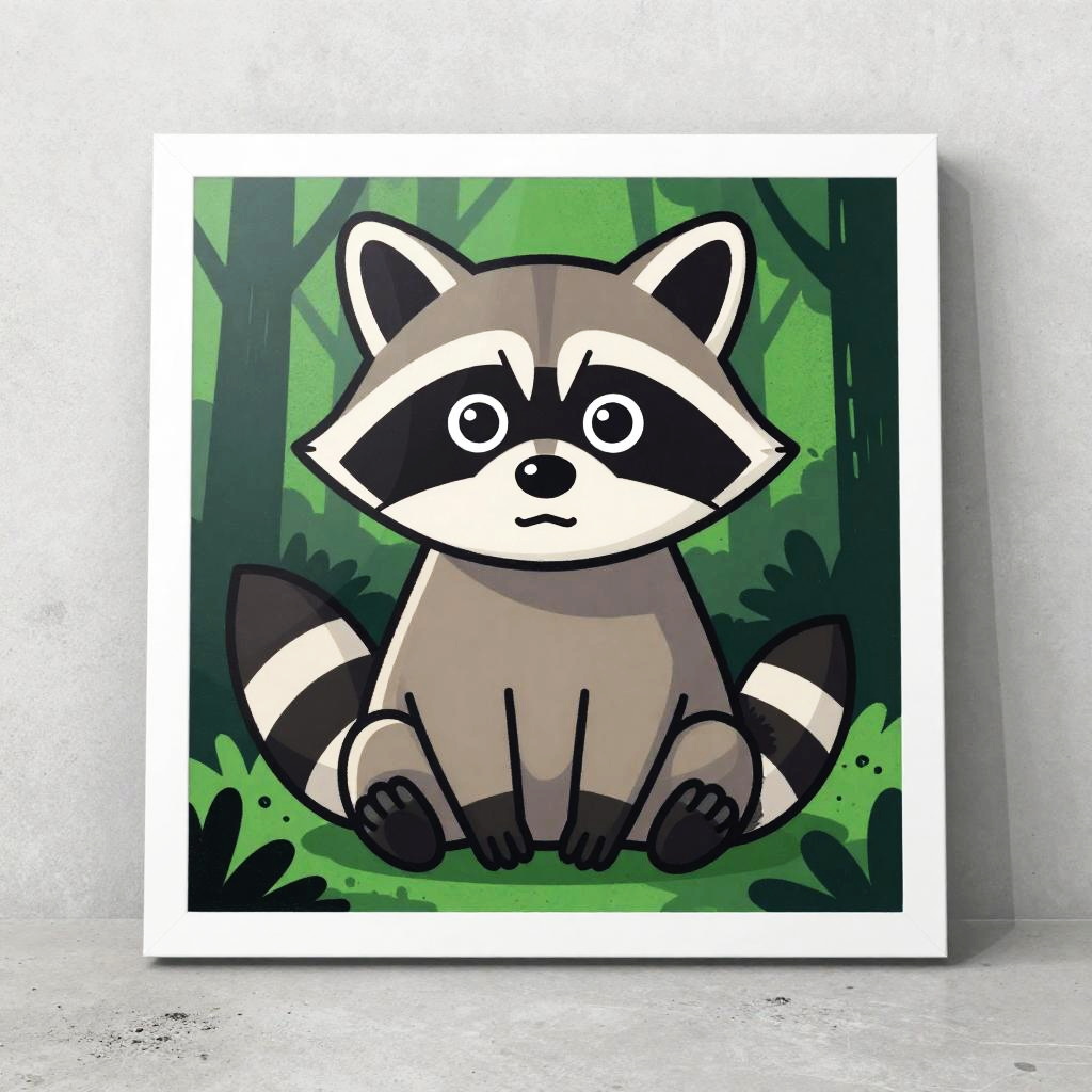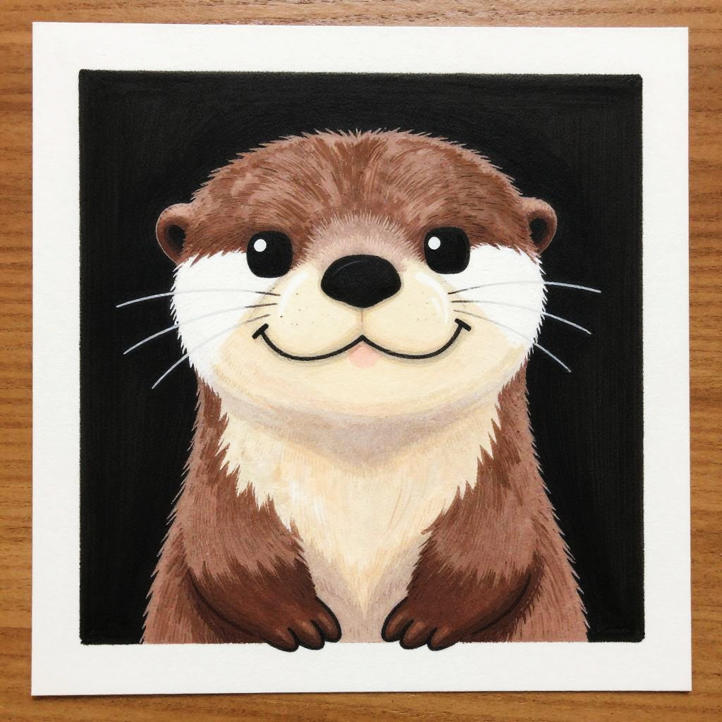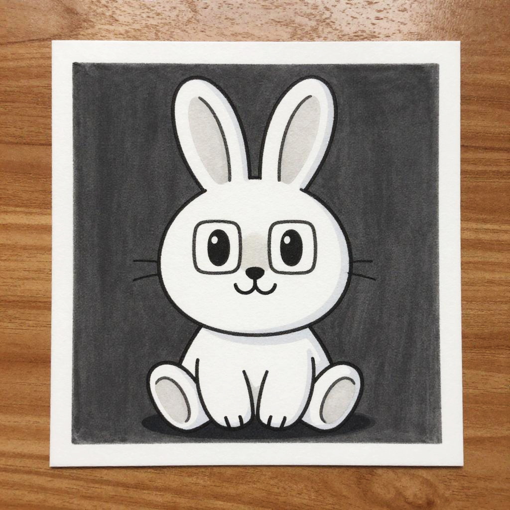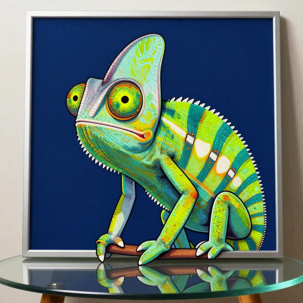 This is a digital drawing of a cartoon dog, with a happy chuckle and large, rectangular eyes for a quirky look. Bright colors with crisp white accents along the face and edges. The character sits against a muted forest green background, bordered by a clean white frame and placed on a rustic wooden tabletop. Rendered in a polished aesthetic with paper grain aesthetic with subtle paper grain, bold linework, and a soft vignette.