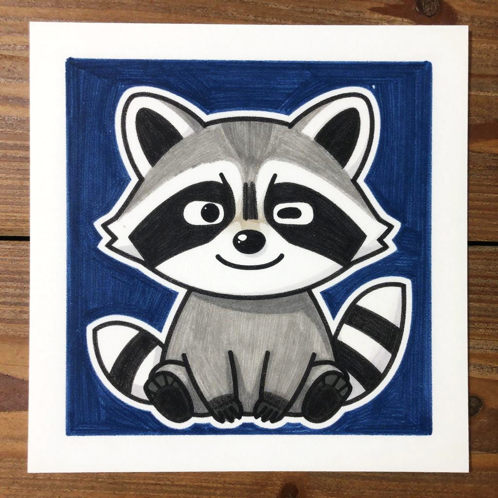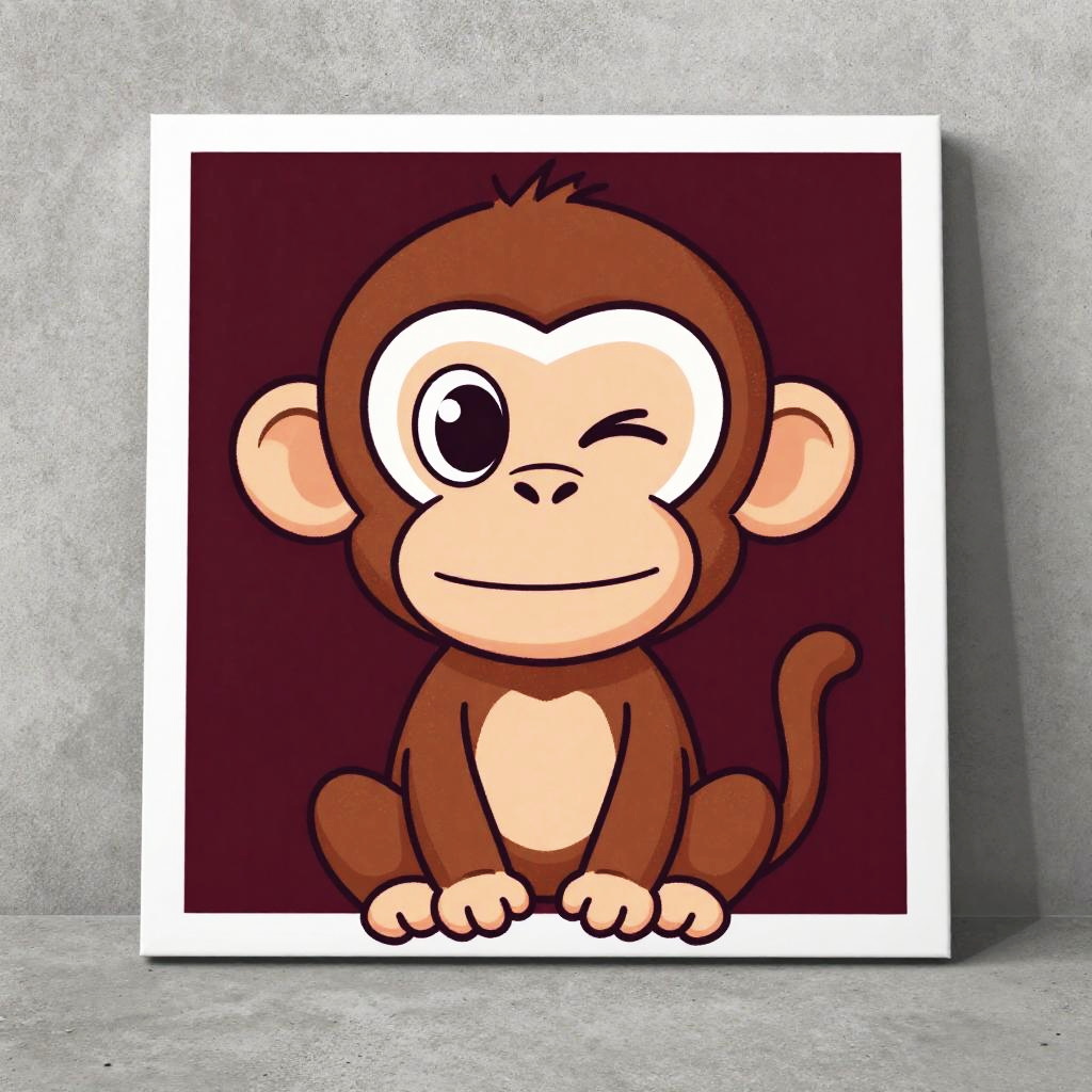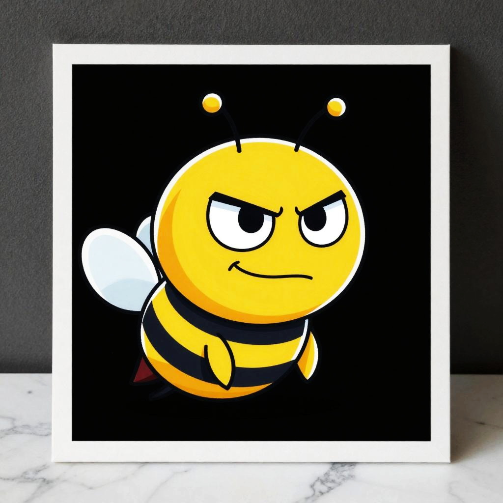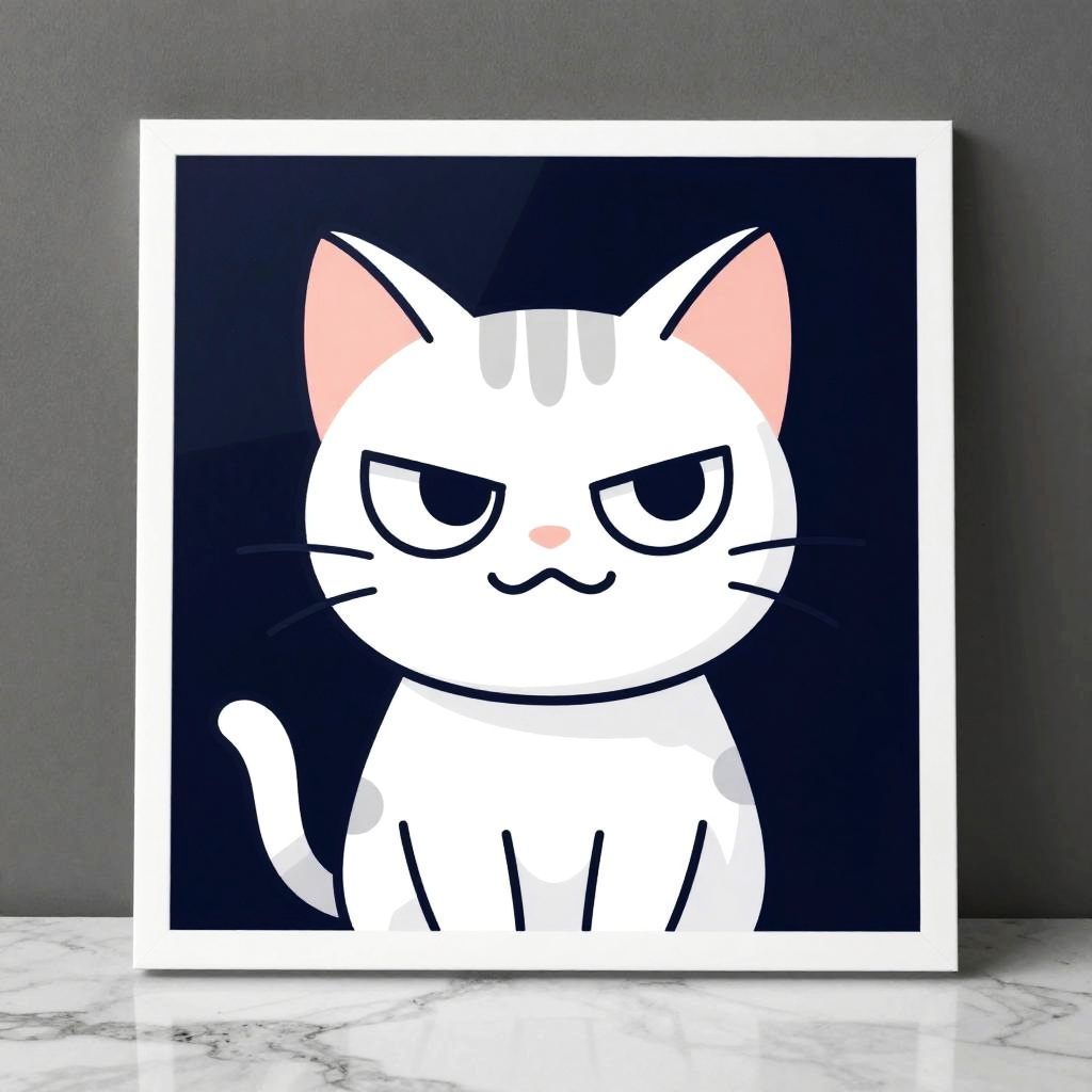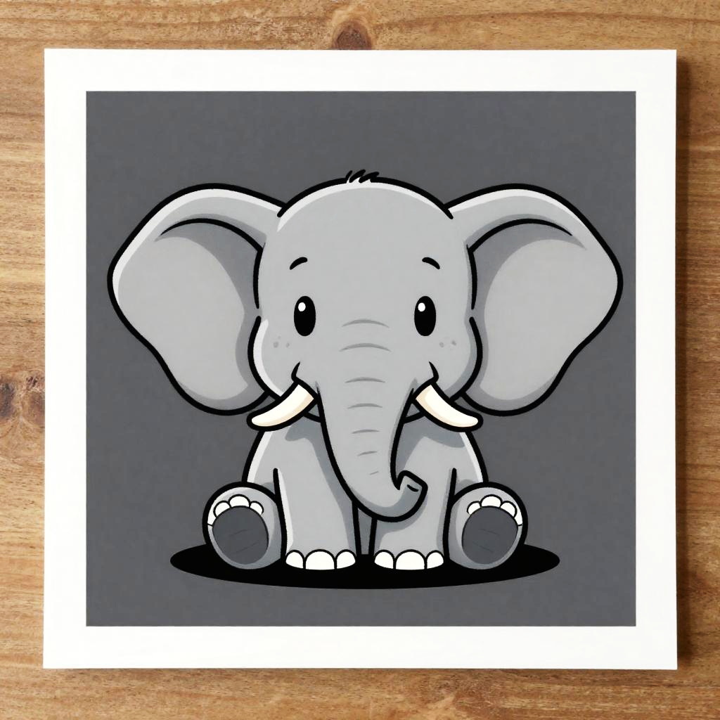 This is a digital drawing of a cartoon dog, with a happy chuckle and large, rectangular eyes for a quirky look. Bright colors with crisp white accents along the face and edges. The character sits against a muted forest green background, bordered by a clean white frame and placed on a rustic wooden tabletop. Rendered in a polished aesthetic with paper grain aesthetic with subtle paper grain, bold linework, and a soft vignette.