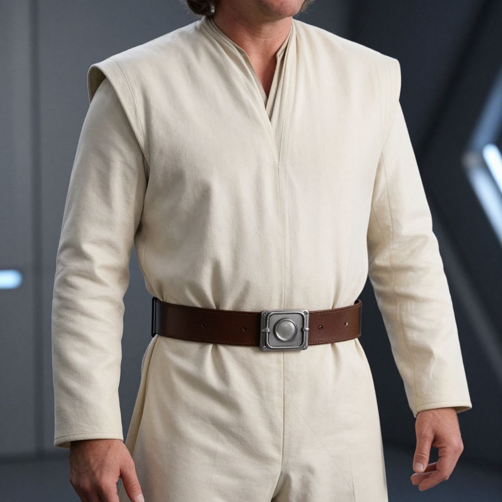 Photograph of a person from the neck to the upper thighs, wearing a cream-colored, long-sleeved Jedi robe with a brown leather belt featuring a silver square buckle. The robe has a V-neck and shoulder capelet. The background is a dimly lit, futuristic room with metallic and dark blue hues, and a blurred, illuminated panel on the left. The person's hands are relaxed by their sides, and only the lower part of their face is visible, with dark hair. The texture of the robe is smooth and slightly reflective. The overall style evokes a Star Wars aesthetic.