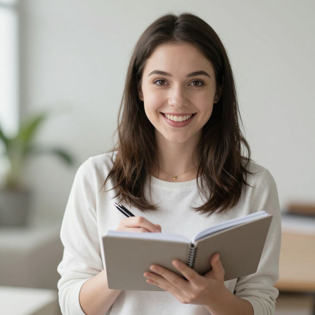 Photograph of a smiling young woman with wavy, dark brown hair and fair skin, wearing a light blue V-neck sweater. She holds an open notebook in her left hand and a black pen in her right, poised to write. She sits at a desk with a laptop partially visible on the right. The background is softly blurred, featuring a light-colored wall and a wooden bookshelf with a few books and a green potted plant. She has dark brown eyes and wears a small, delicate necklace with a small pendant. The lighting is natural and bright, enhancing her warm, friendly expression.