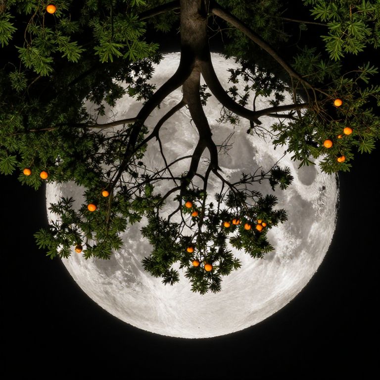 Trees grow upside-down from the moon’s surface, their roots dancing in the endless night sky and their fruit glowing with borrowed sunlight.