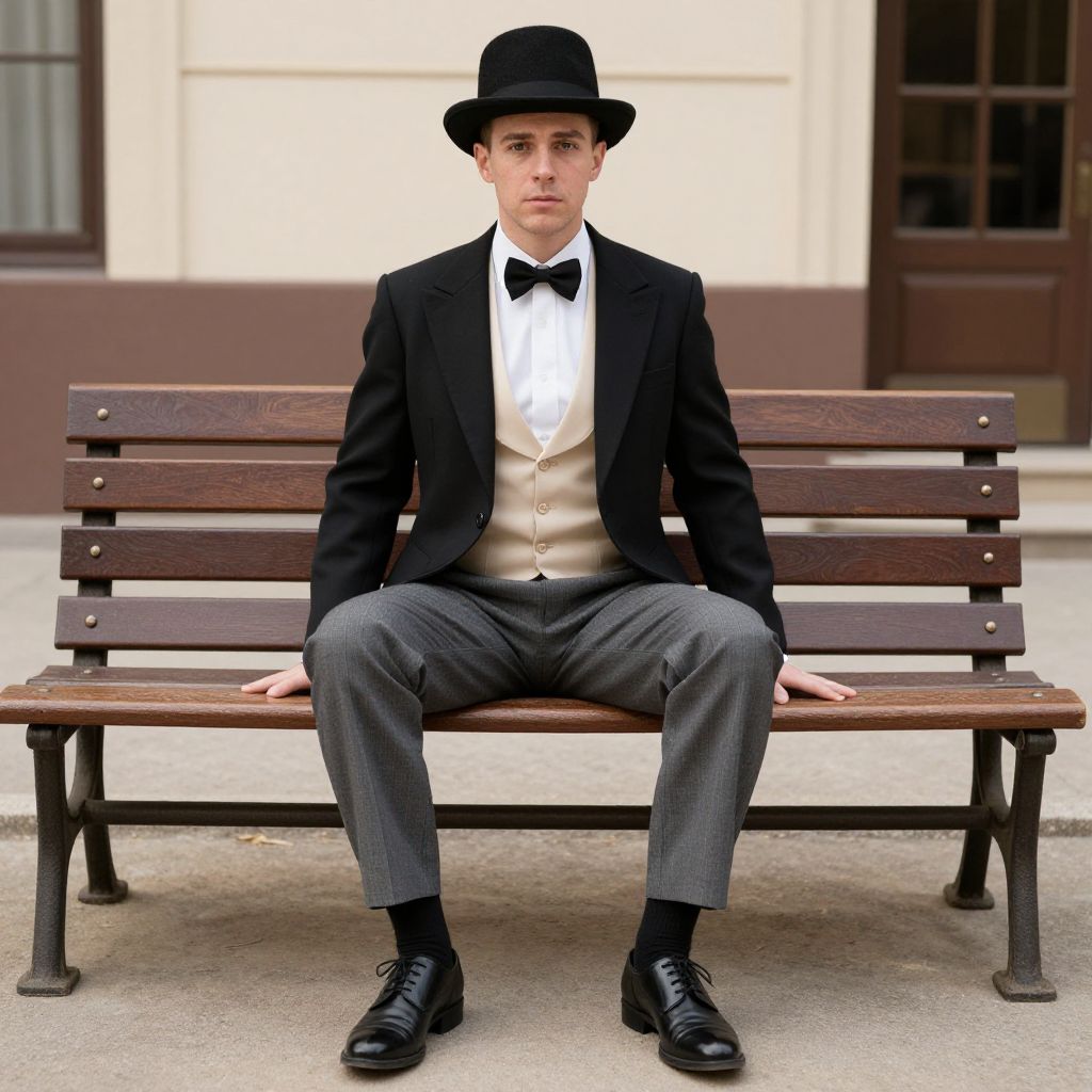 Vintage Fashion Man Costume, man in a hat and bow tie sitting on a bench