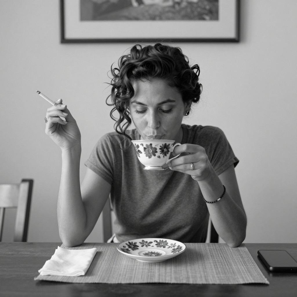 Black-and-white photograph of a woman with short, curly hair standing beside an easel and painting. She wears a dark long-sleeve top and pants, holding a paintbrush in her right hand and a small object in her left. A baby in a vintage stroller with four wheels and a white cloth sits behind her, looking at her. The woman stands on a stone pavement next to a large stone wall. A plastic bag is on the ground near the stroller.