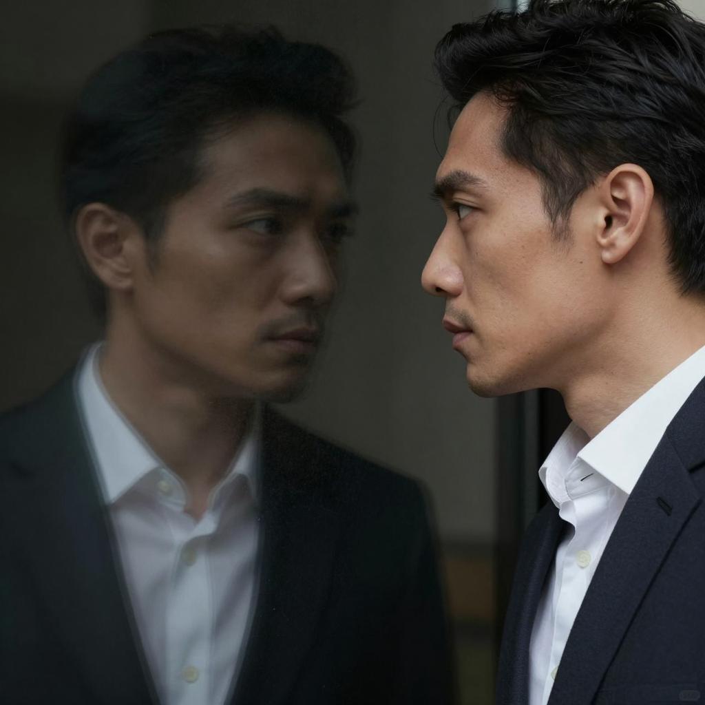Photograph of a middle-aged man with pale skin, dark hair, and intense gaze in profile. Dark, dramatic sky with greenish-blue clouds and lightning over a cityscape in the background. Black on left, cityscape and sky on right.