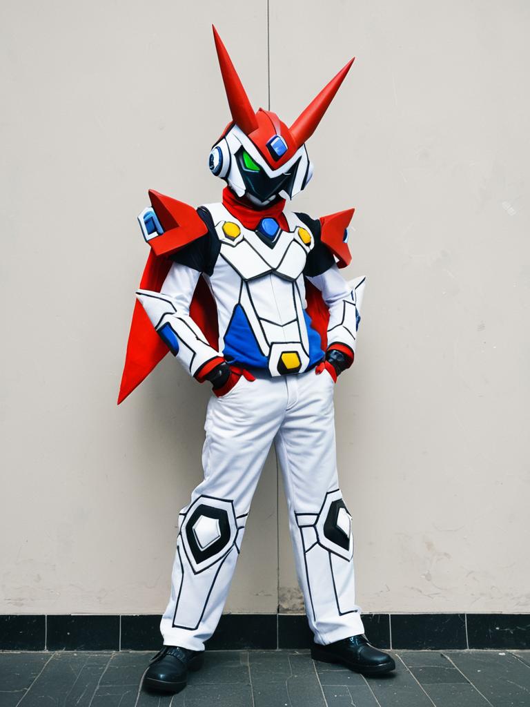 Man cosplay. Wearing Shoutmon costume. Realistic photo. Dressed as Shoutmon --sref 1400
