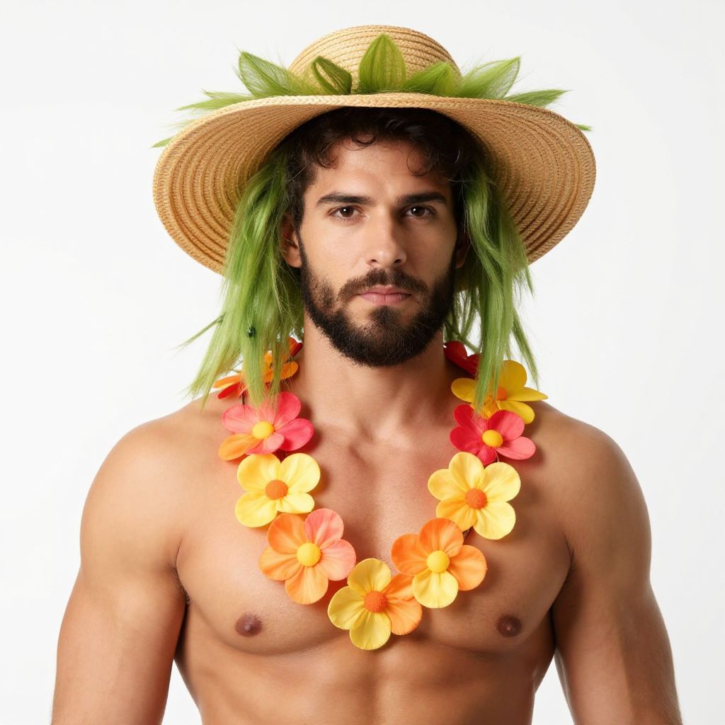 Man lilo costume, 1boy, flower necklace, male focus, solo, facial hair, beard, hat, plant, straw hat, topless male, muscular, looking at viewer